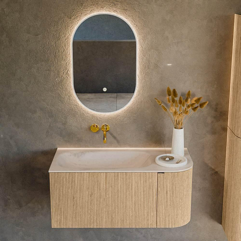 MONDIAZ KURVE-DLUX 95cm badmeubel ronding Rechts kleur Oak met 1 lade en 1 deur. Wastafel BIG SMALL Links zonder kraangat Meli.