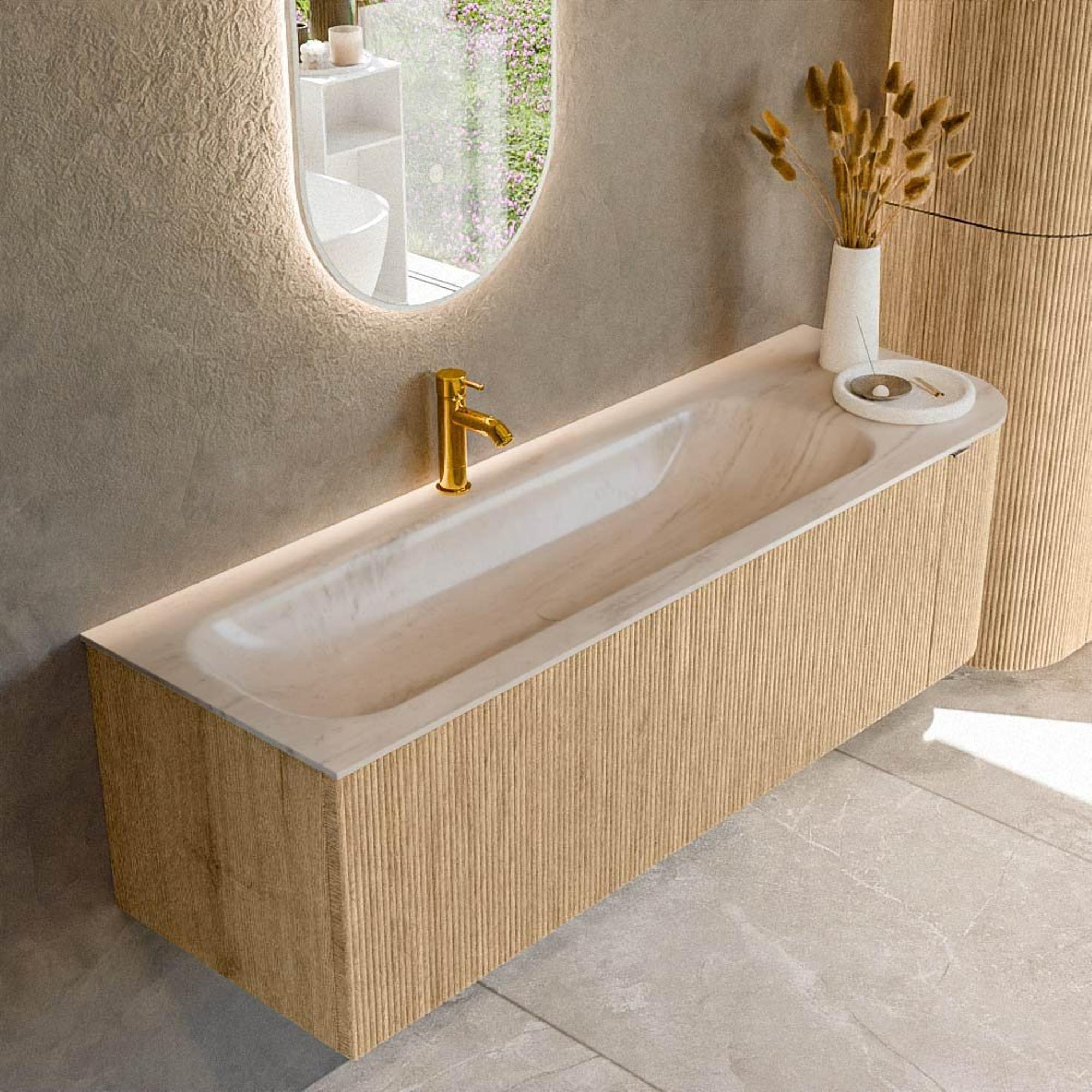 MONDIAZ KURVE-DLUX 145cm badmeubel ronding Rechts kleur Oak met 1 lade en 1 deur. Wastafel BIG LARGE Links 1 kraangat Meli.