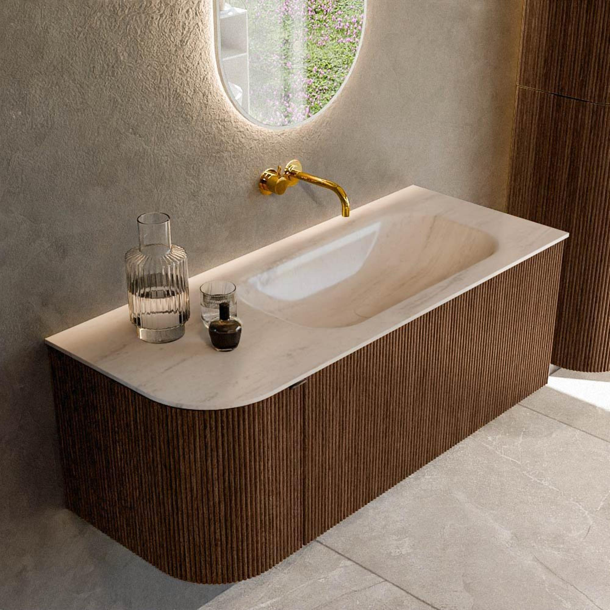 MONDIAZ KURVE-DLUX 115cm badmeubel ronding Links kleur Walnut met 1 lade en 1 deur. Wastafel BIG SMALL Rechts zonder kraangat Meli.