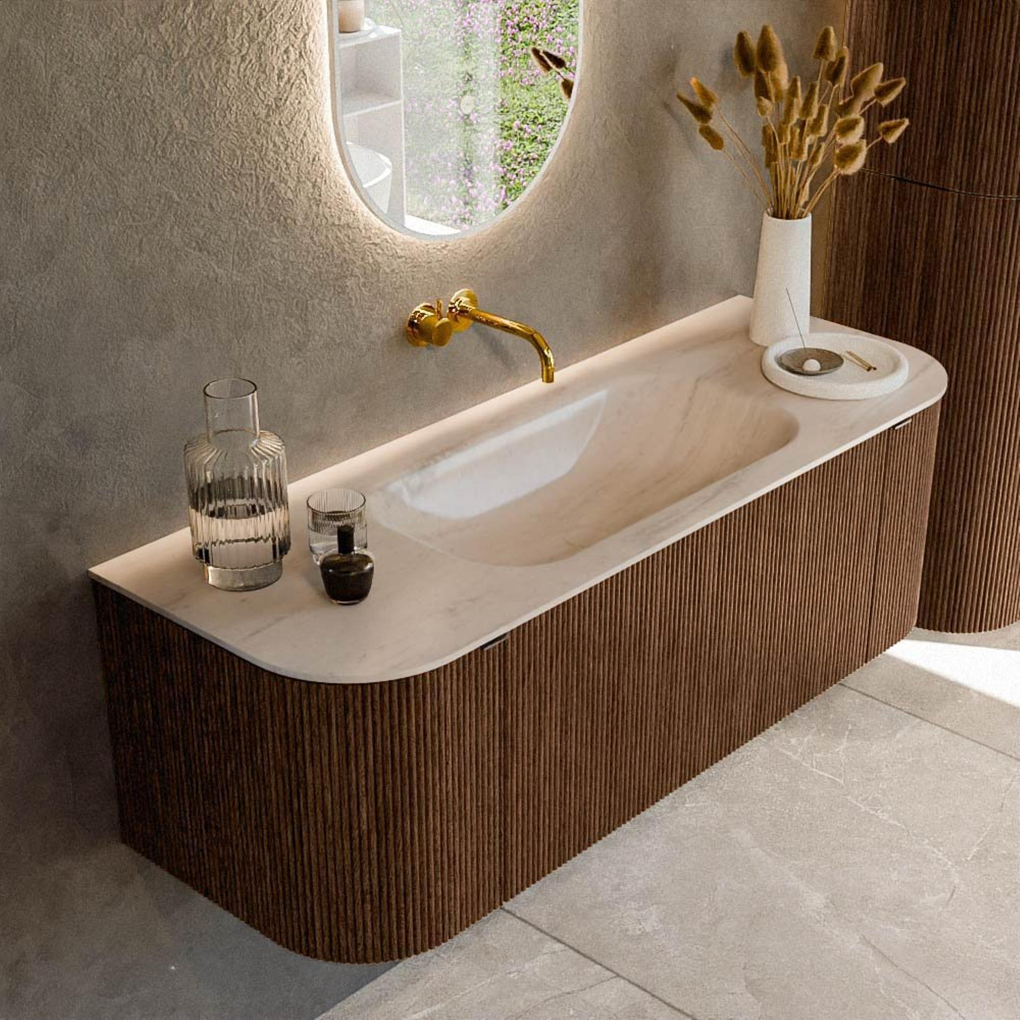 MONDIAZ KURVE-DLUX 130cm badmeubel ronding Links + Rechts kleur Walnut met 1 lade en 2 deuren. Wastafel BIG SMALL Midden zonder kraangat Meli.