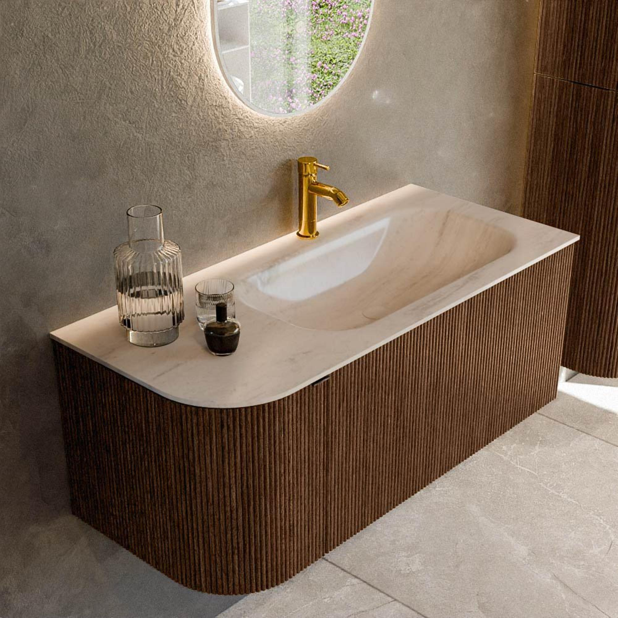MONDIAZ KURVE-DLUX 105cm badmeubel ronding Links kleur Walnut met 1 lade en 1 deur. Wastafel BIG SMALL Rechts 1 kraangat Meli.