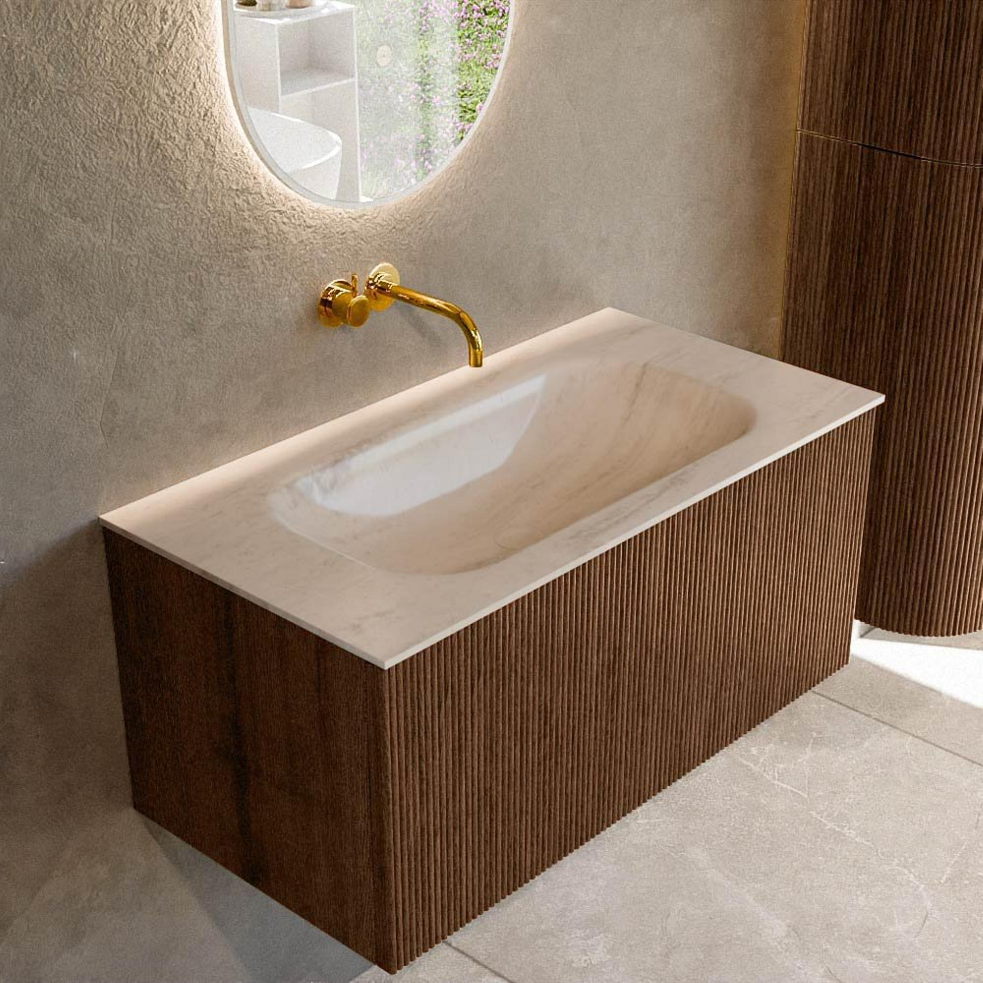 MONDIAZ KURVE-DLUX 90cm badmeubel kleur Walnut met 1 lade en 0 deuren. Wastafel BIG SMALL Midden zonder kraangat Meli.
