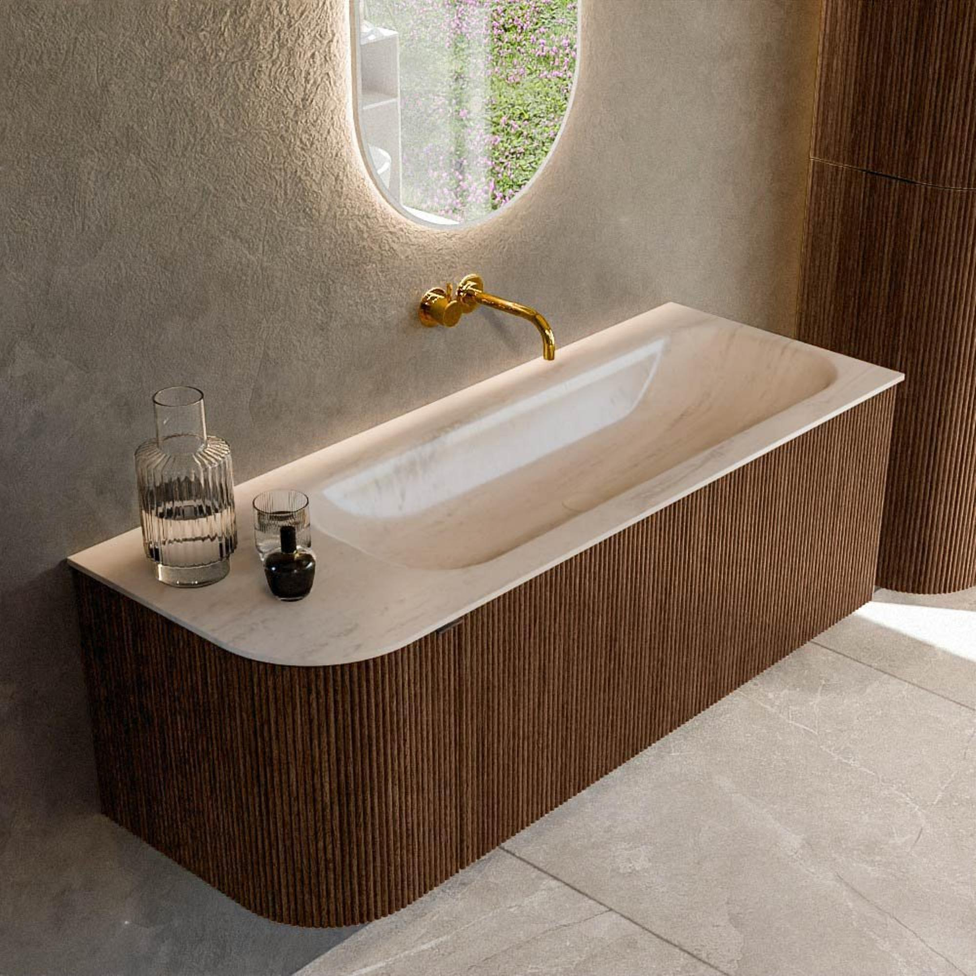 MONDIAZ KURVE-DLUX 125cm badmeubel ronding Links kleur Walnut met 1 lade en 1 deur. Wastafel BIG MEDIUM Rechts zonder kraangat Meli.