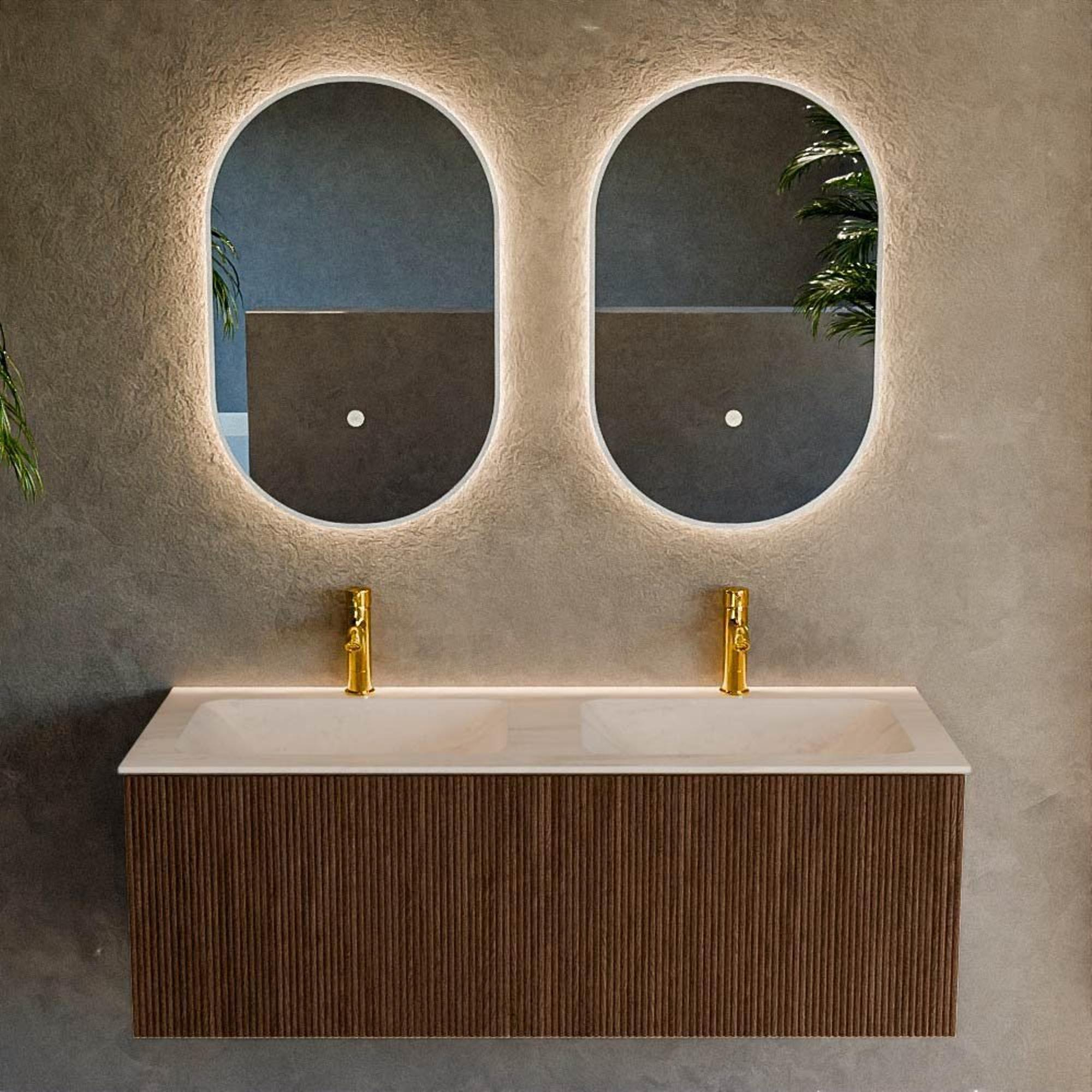 MONDIAZ KURVE-DLUX 120cm badmeubel kleur Walnut met 1 lade en 0 deuren. Wastafel LEAF Dubbel 2 kraangaten Meli.