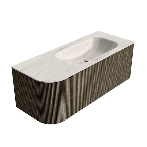 MONDIAZ KURVE-DLUX 115cm badmeubel ronding Links kleur Shadow met 1 lade en 1 deur. Wastafel BIG SMALL Rechts 1 kraangat Meli.