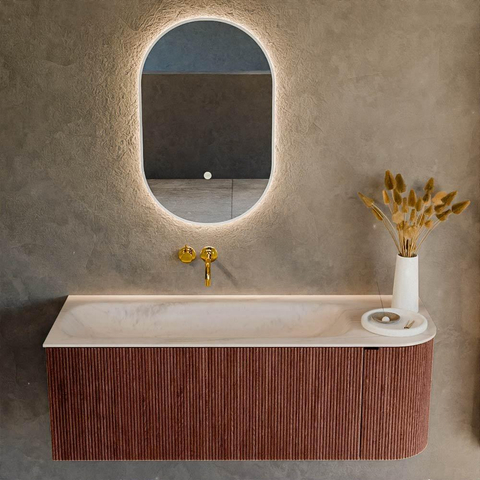 MONDIAZ KURVE-DLUX 125cm badmeubel ronding Rechts kleur Ruby met 1 lade en 1 deur. Wastafel BIG MEDIUM Links zonder kraangat Meli.