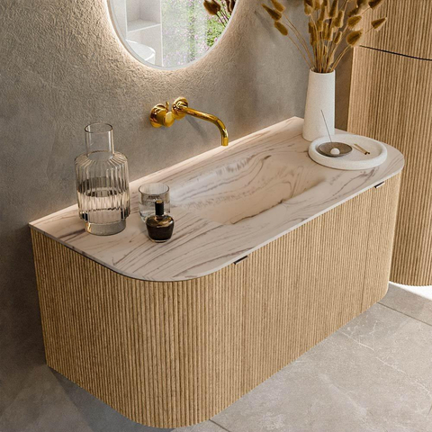 MONDIAZ KURVE-DLUX 100cm badmeubel ronding Links + Rechts kleur Oak met 1 lade en 2 deuren. Wastafel GRUNNE Midden zonder kraangat Nata.