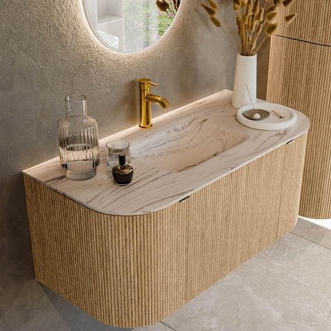 MONDIAZ KURVE-DLUX 100cm badmeubel ronding Links + Rechts kleur Oak met 1 lade en 2 deuren. Wastafel GRUNNE Midden 1 kraangat Nata.
