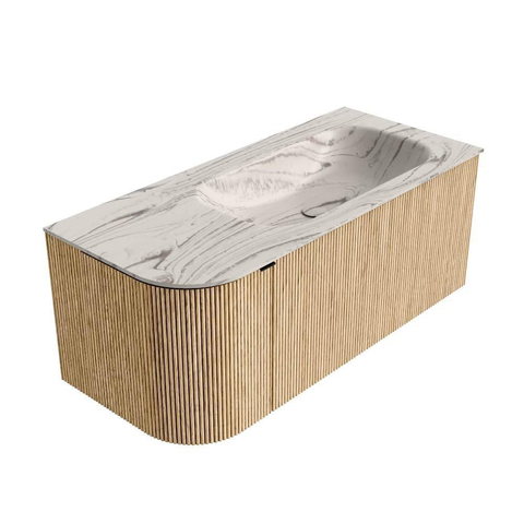 MONDIAZ KURVE-DLUX 105cm badmeubel ronding Links kleur Oak met 1 lade en 1 deur. Wastafel BIG SMALL Rechts 1 kraangat Nata.