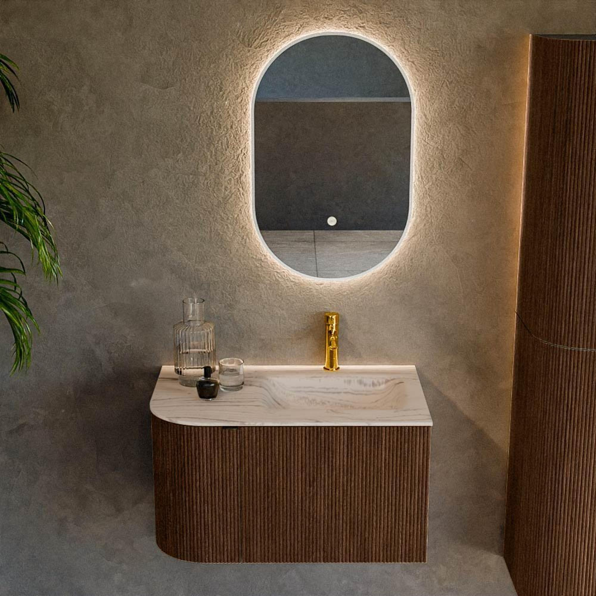 MONDIAZ KURVE-DLUX 75cm badmeubel ronding Links kleur Walnut met 1 lade en 1 deur. Wastafel GRUNNE Rechts 1 kraangat Nata.