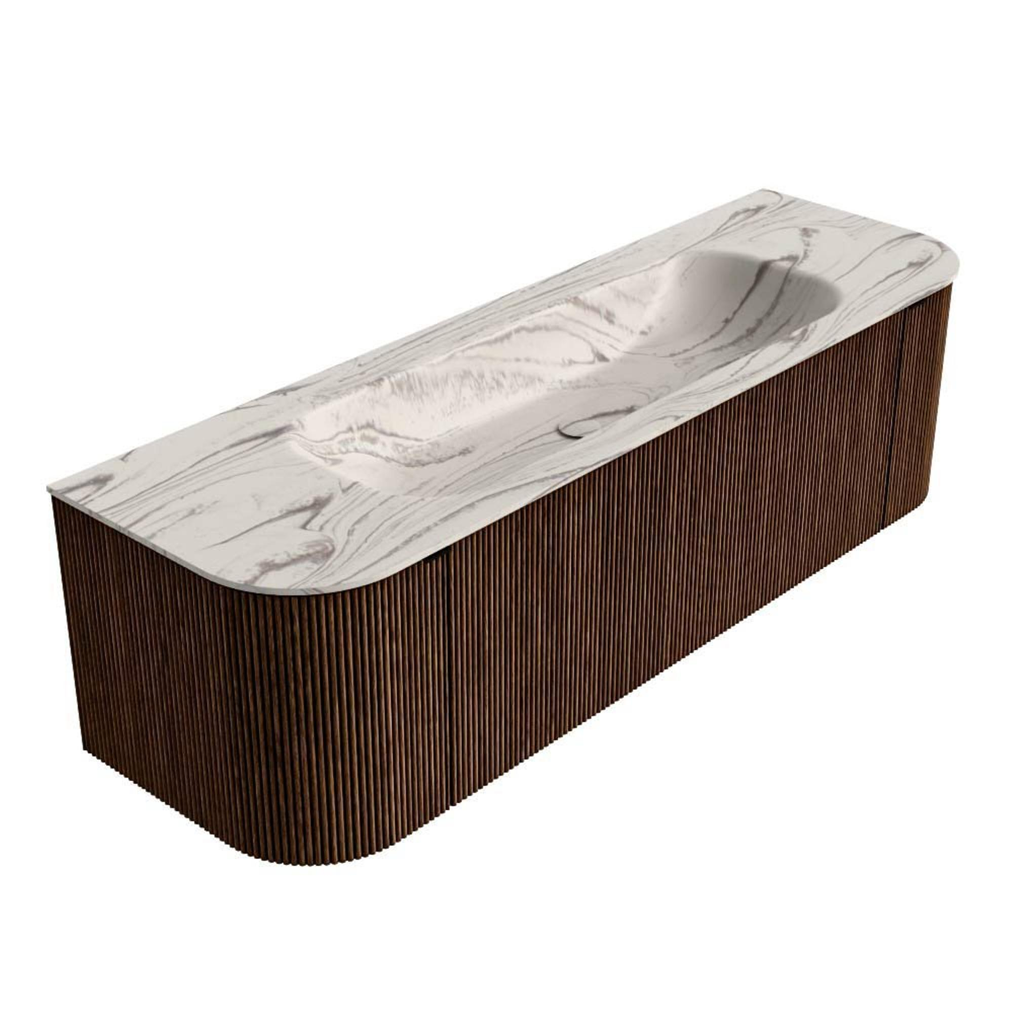 MONDIAZ KURVE-DLUX 150cm badmeubel ronding Links + Rechts kleur Walnut met 1 lade en 2 deuren. Wastafel BIG MEDIUM Midden zonder kraangat Nata.