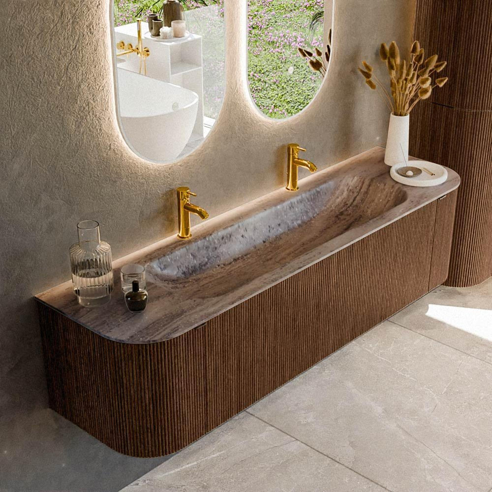 MONDIAZ KURVE-DLUX 170cm badmeubel ronding Links + Rechts kleur Walnut met 1 lade en 2 deuren. Wastafel BIG LARGE Midden 2 kraangaten Oza.