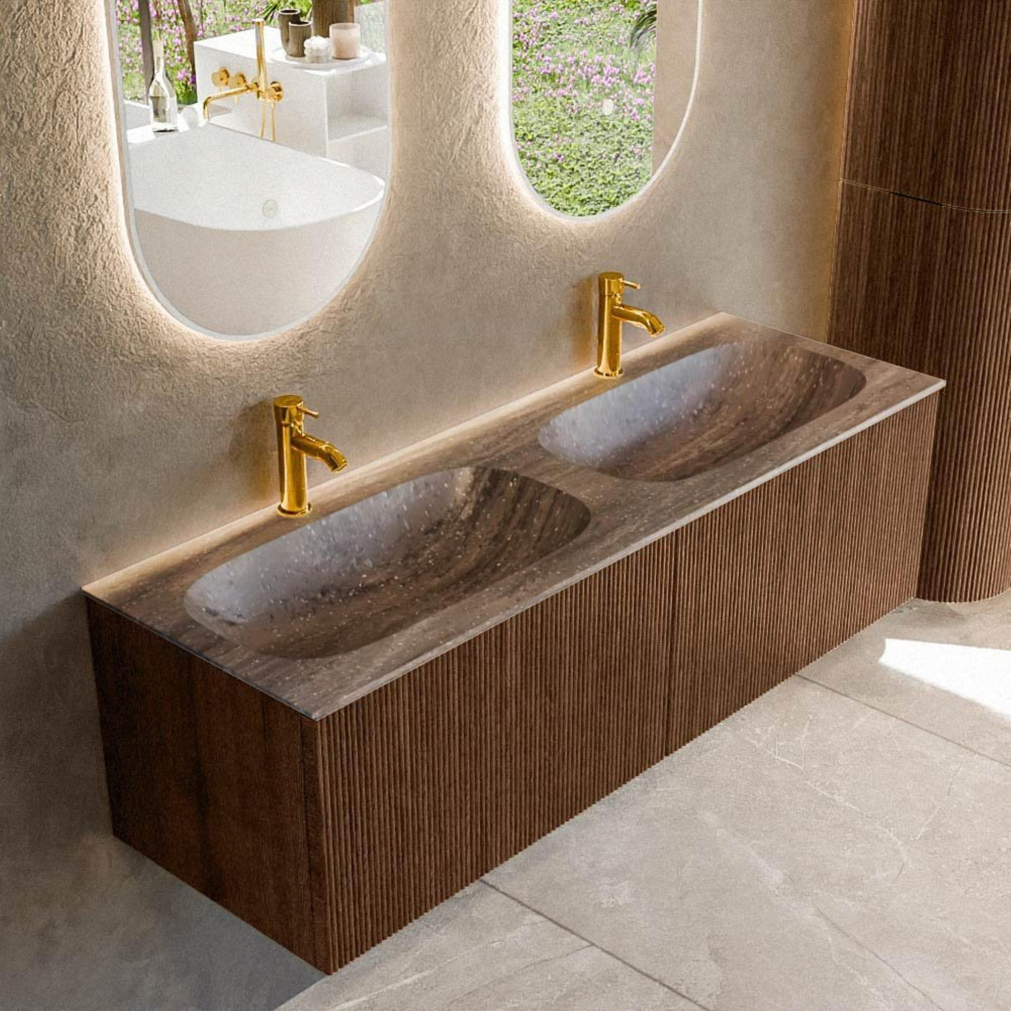 MONDIAZ KURVE-DLUX 140cm badmeubel kleur Walnut met 2 lades en 0 deuren. Wastafel STOR SMALL Dubbel 2 kraangaten Oza.
