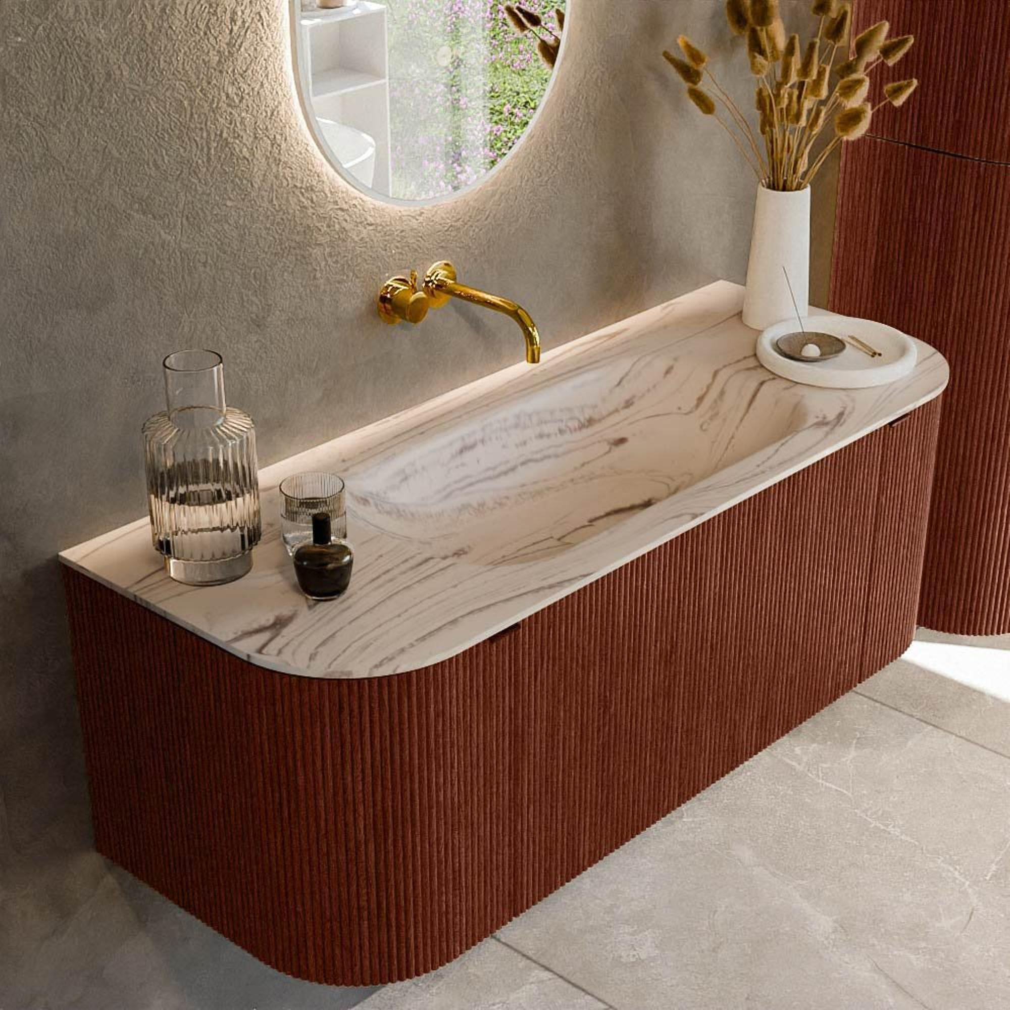 MONDIAZ KURVE-DLUX 120cm badmeubel ronding Links + Rechts kleur Ruby met 1 lade en 2 deuren. Wastafel BIG SMALL Midden zonder kraangat Nata.