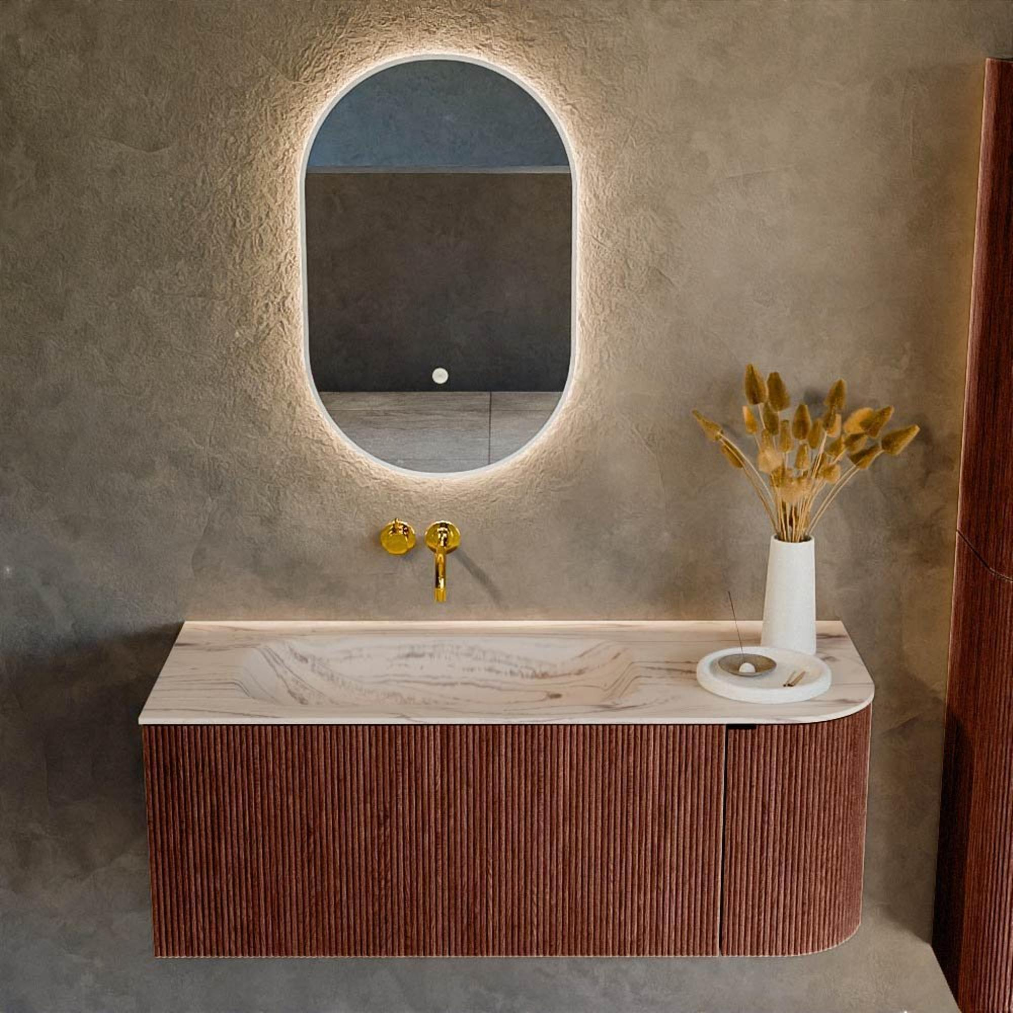 MONDIAZ KURVE-DLUX 115cm badmeubel ronding Rechts kleur Ruby met 1 lade en 1 deur. Wastafel BIG SMALL Links zonder kraangat Nata.