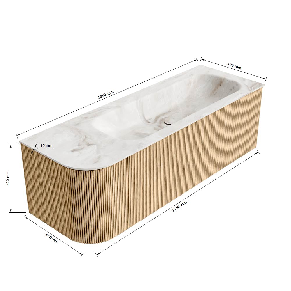 MONDIAZ KURVE-DLUX 135cm badmeubel ronding Links kleur Ruby met 1 lade en 1 deur. Wastafel BIG MEDIUM Rechts 1 kraangat Nata.