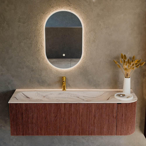 MONDIAZ KURVE-DLUX 145cm badmeubel ronding Rechts kleur Ruby met 1 lade en 1 deur. Wastafel BIG LARGE Links 1 kraangat Nata.
