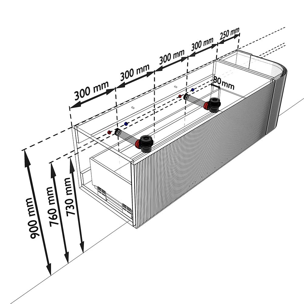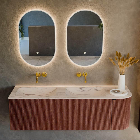 MONDIAZ KURVE-DLUX 145cm badmeubel ronding Rechts kleur Ruby met 1 lade en 1 deur. Wastafel LEAF Dubbel / Links zonder kraangat Nata.