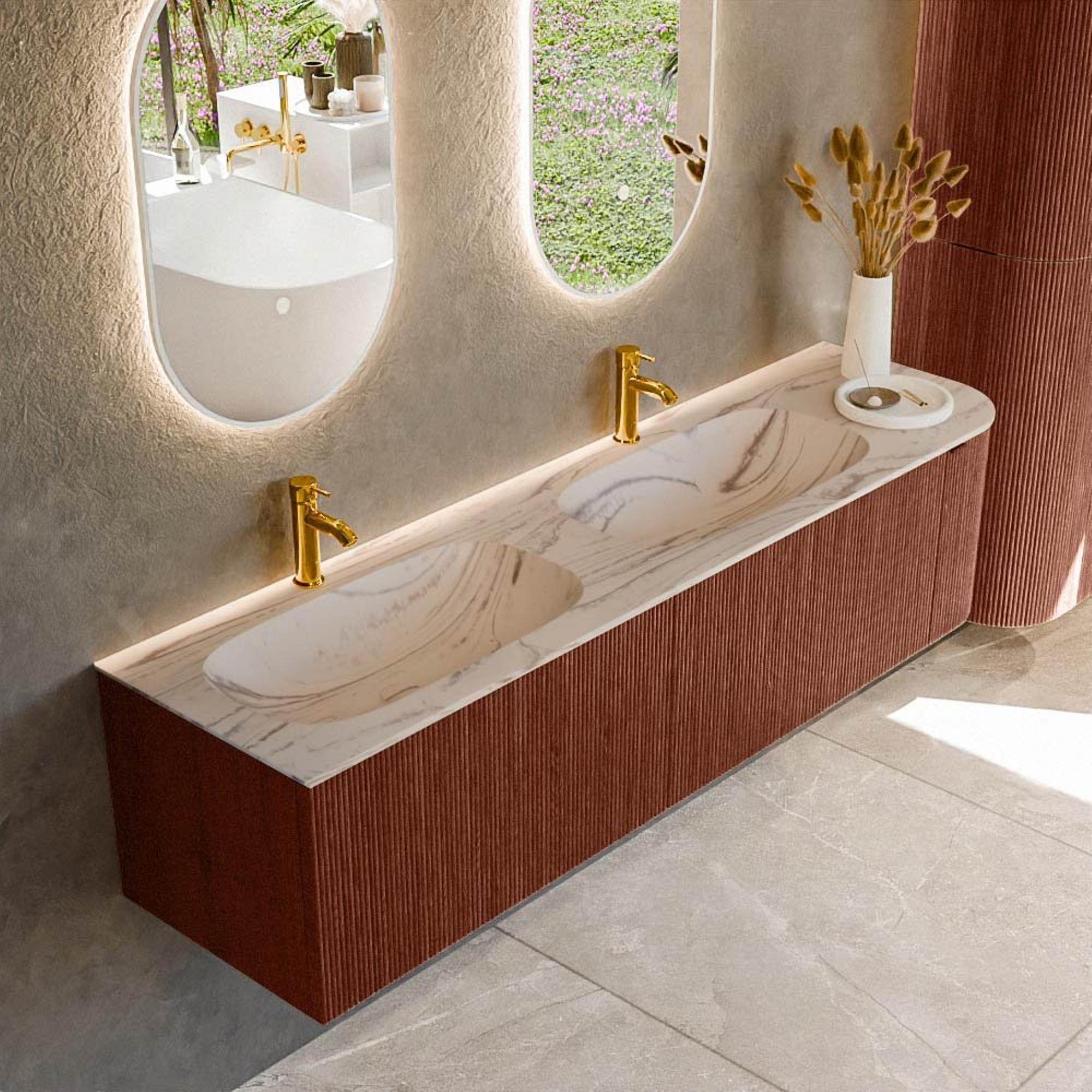 MONDIAZ KURVE-DLUX 175cm badmeubel ronding Rechts kleur Ruby met 2 lades en 1 deur. Wastafel STOR SMALL Dubbel / Links 2 kraangaten Nata.
