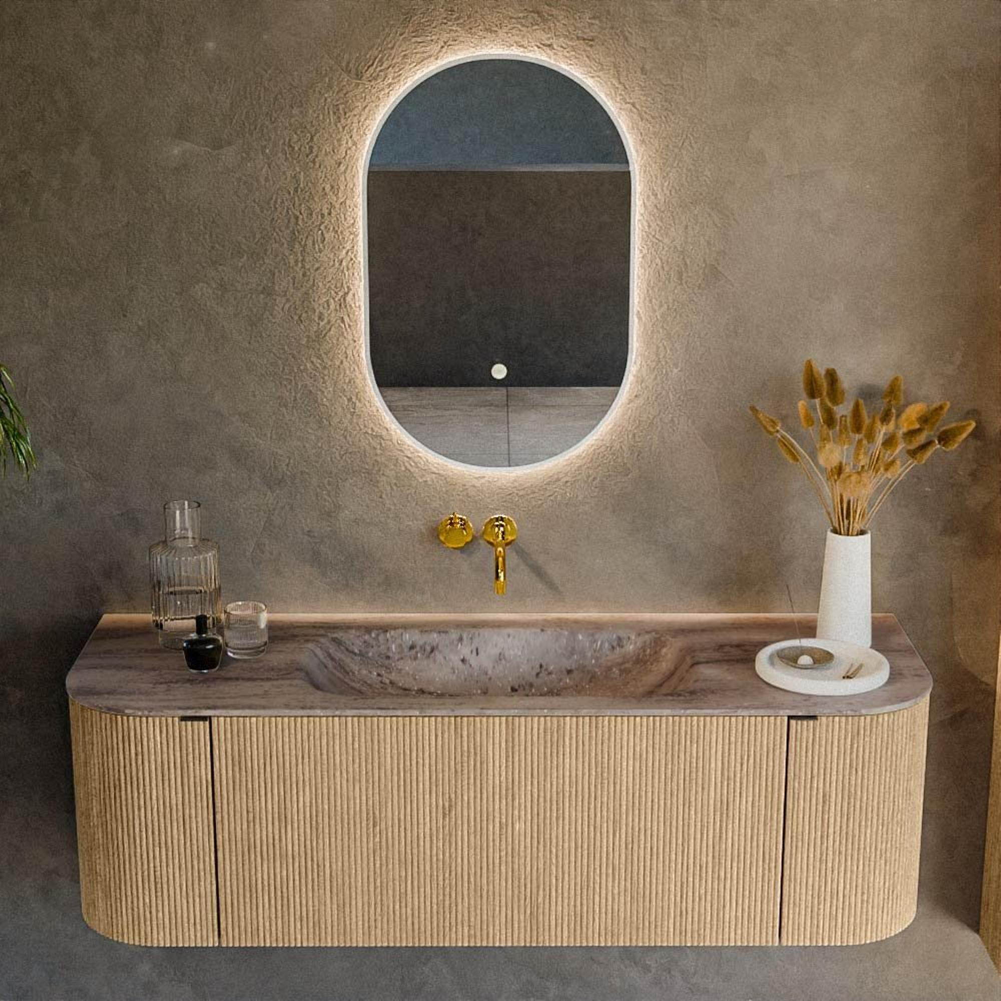 MONDIAZ KURVE-DLUX 140cm badmeubel ronding Links + Rechts kleur Oak met 1 lade en 2 deuren. Wastafel BIG SMALL Midden zonder kraangat Oza.