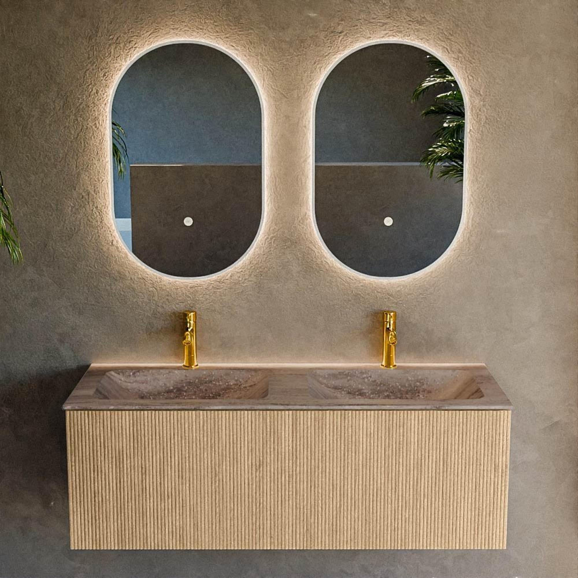 MONDIAZ KURVE-DLUX 120cm badmeubel kleur Oak met 1 lade en 0 deuren. Wastafel LEAF Dubbel 2 kraangaten Oza.