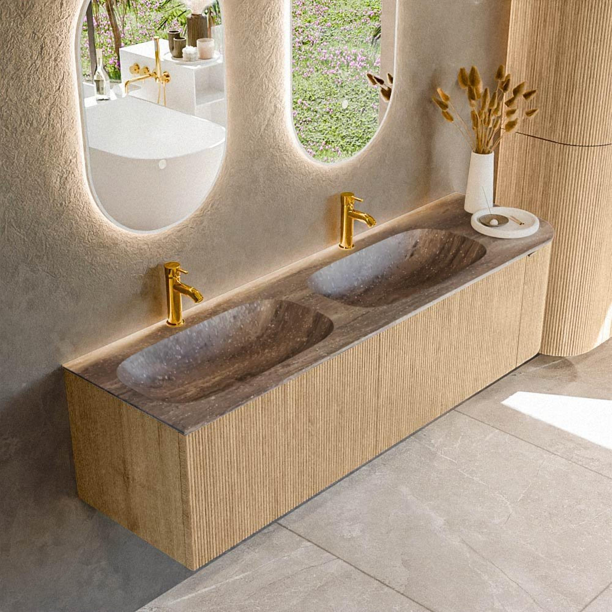 MONDIAZ KURVE-DLUX 165cm badmeubel ronding Rechts kleur Oak met 2 lades en 1 deur. Wastafel STOR SMALL Dubbel / Links 2 kraangaten Oza.