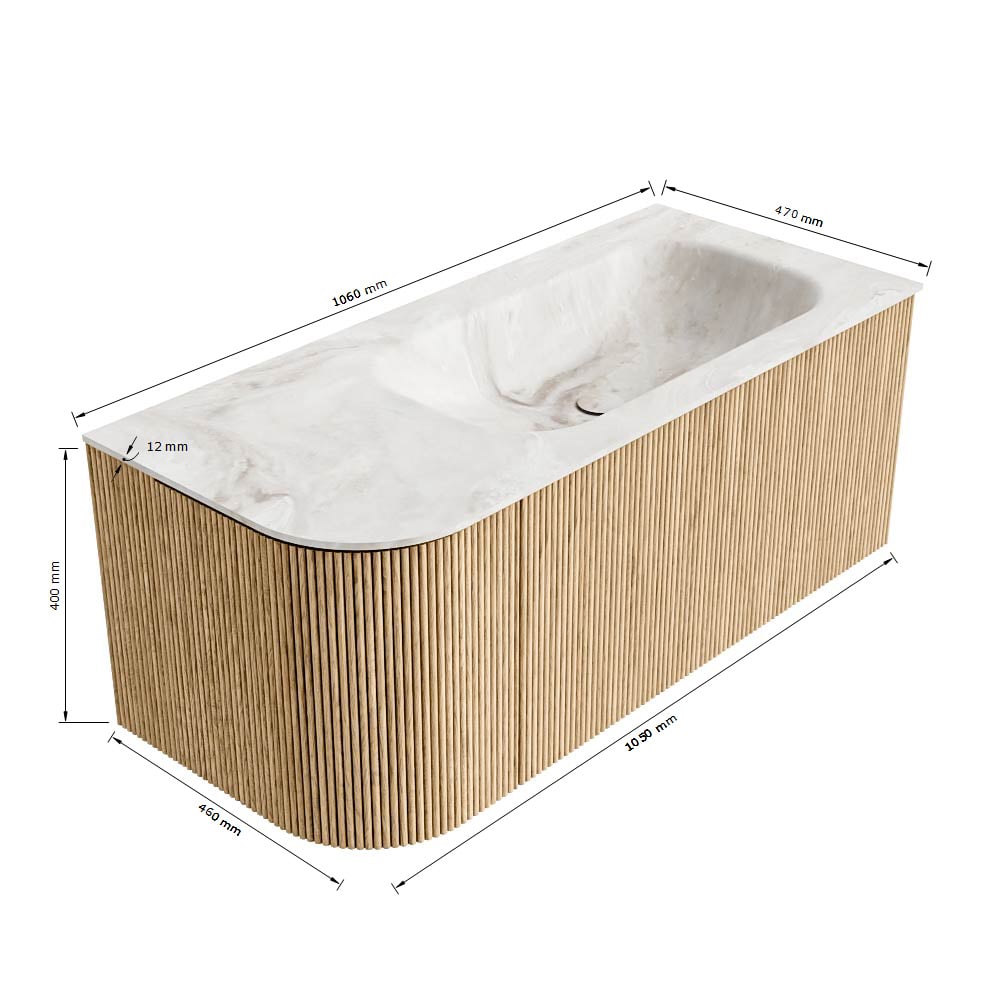 MONDIAZ KURVE-DLUX 105cm badmeubel ronding Links kleur Walnut met 1 lade en 1 deur. Wastafel BIG SMALL Rechts zonder kraangat Oza.