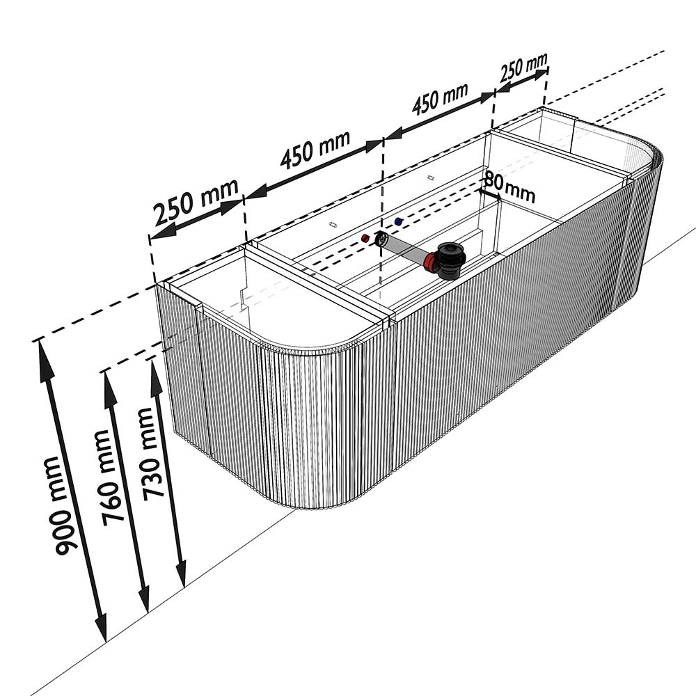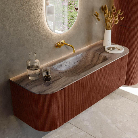 MONDIAZ KURVE-DLUX 140cm badmeubel ronding Links + Rechts kleur Ruby met 1 lade en 2 deuren. Wastafel BIG SMALL Midden zonder kraangat Oza.