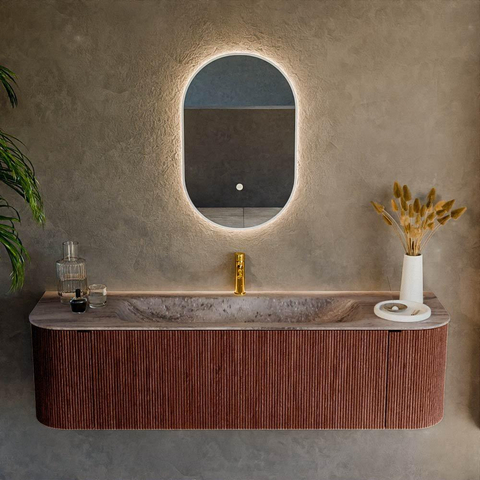 MONDIAZ KURVE-DLUX 160cm badmeubel ronding Links + Rechts kleur Ruby met 1 lade en 2 deuren. Wastafel BIG MEDIUM Midden 1 kraangat Oza.