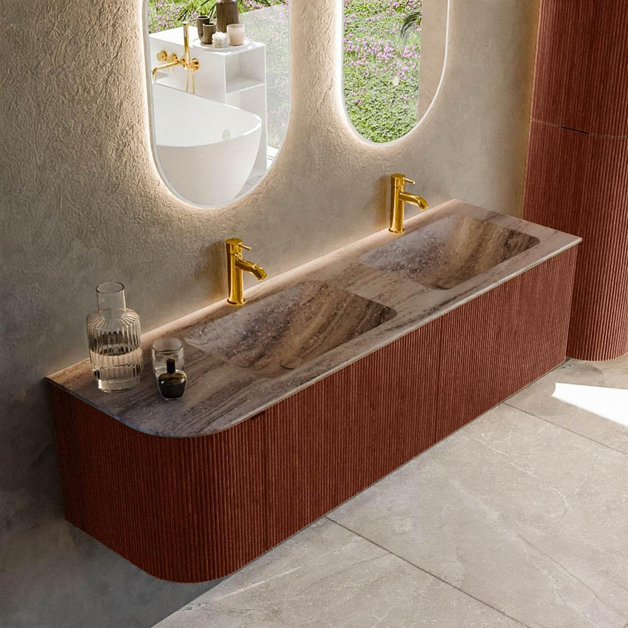 MONDIAZ KURVE-DLUX 155cm badmeubel ronding Links kleur Ruby met 2 lades en 1 deur. Wastafel LEAF Dubbel / Rechts 2 kraangaten Oza.