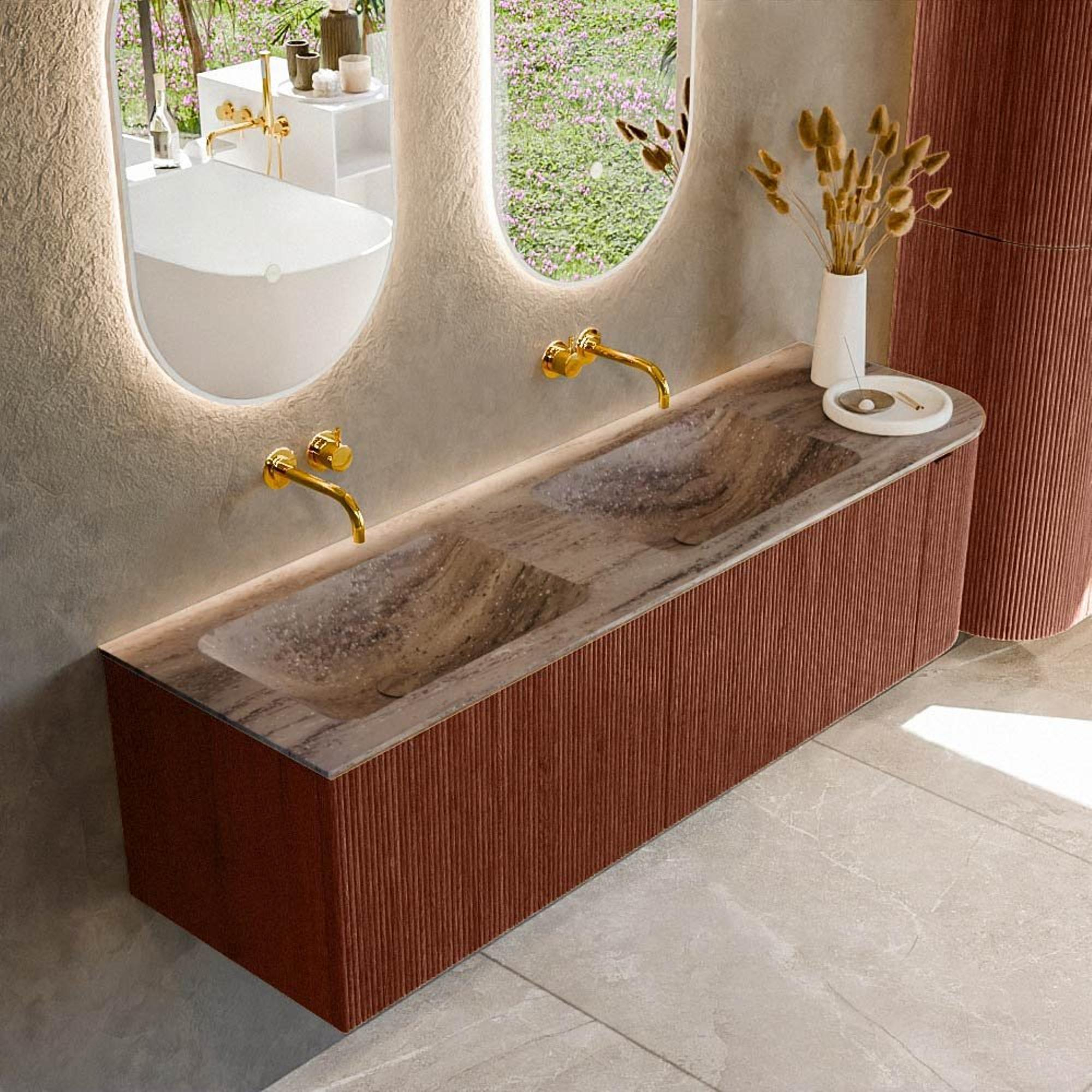 MONDIAZ KURVE-DLUX 155cm badmeubel ronding Rechts kleur Ruby met 2 lades en 1 deur. Wastafel LEAF Dubbel / Links zonder kraangat Oza.