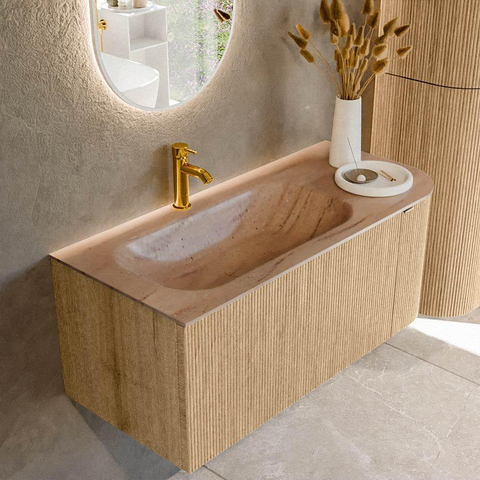 MONDIAZ KURVE-DLUX 105cm badmeubel ronding Rechts kleur Oak met 1 lade en 1 deur. Wastafel BIG SMALL Links 1 kraangat Saba.
