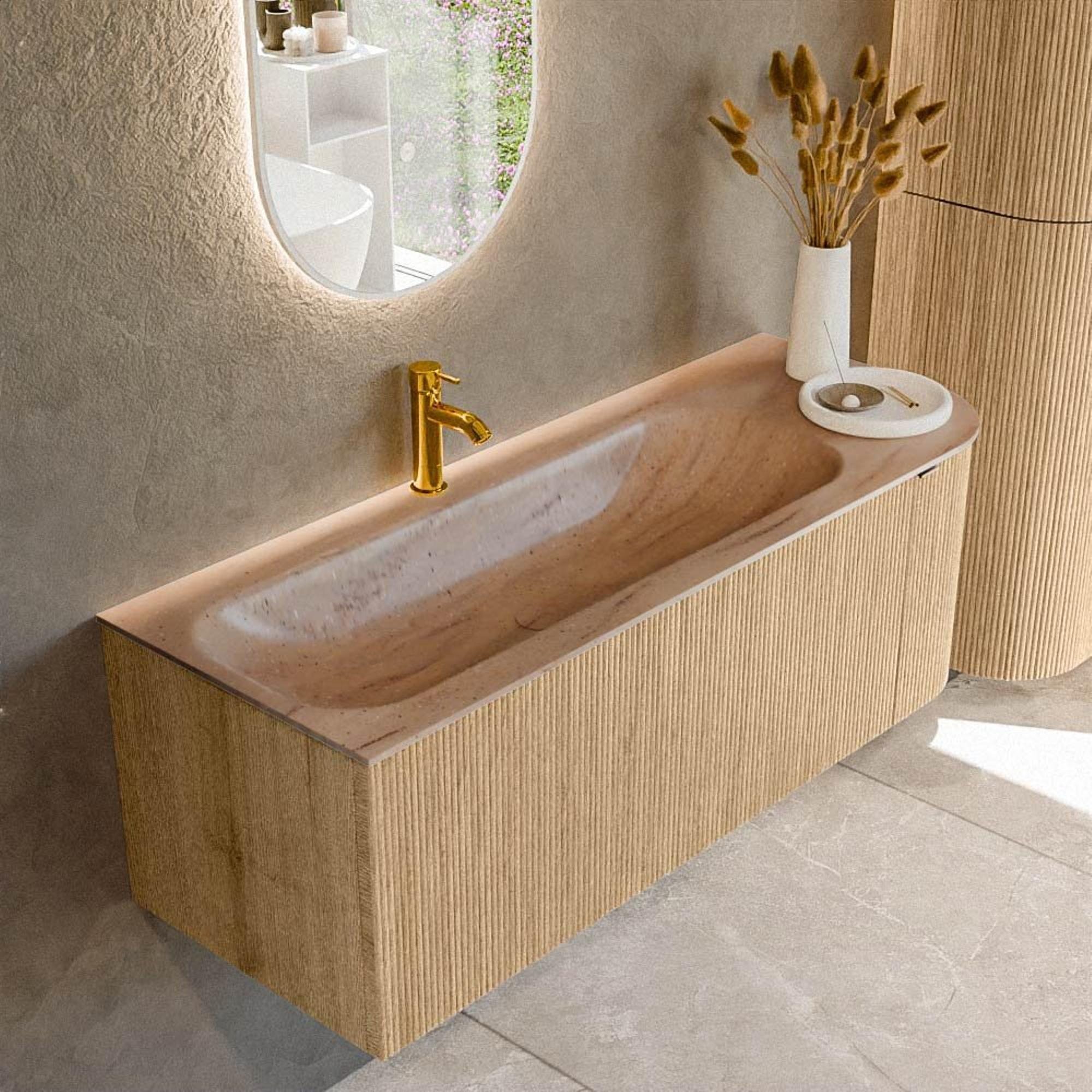 MONDIAZ KURVE-DLUX 125cm badmeubel ronding Rechts kleur Oak met 1 lade en 1 deur. Wastafel BIG MEDIUM Links 1 kraangat Saba.