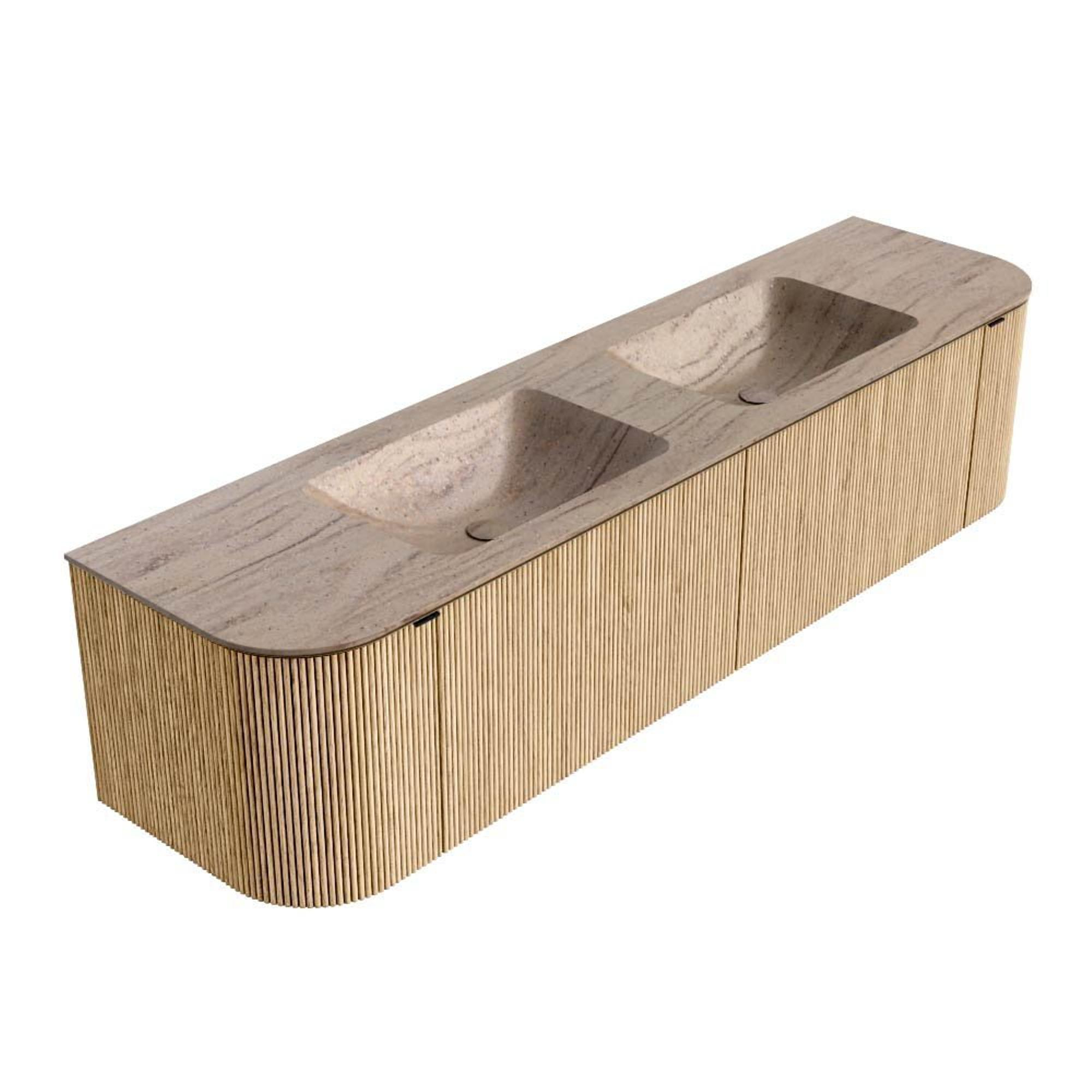 MONDIAZ KURVE-DLUX 180cm badmeubel ronding Links + Rechts kleur Oak met 2 lades en 2 deuren. Wastafel LEAF Dubbel 2 kraangaten Saba.