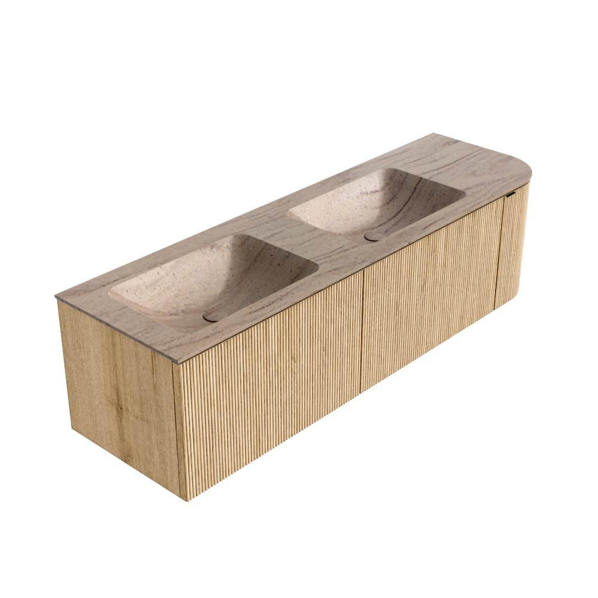 MONDIAZ KURVE-DLUX 155cm badmeubel ronding Rechts kleur Oak met 2 lades en 1 deur. Wastafel LEAF Dubbel / Links 2 kraangaten Saba.