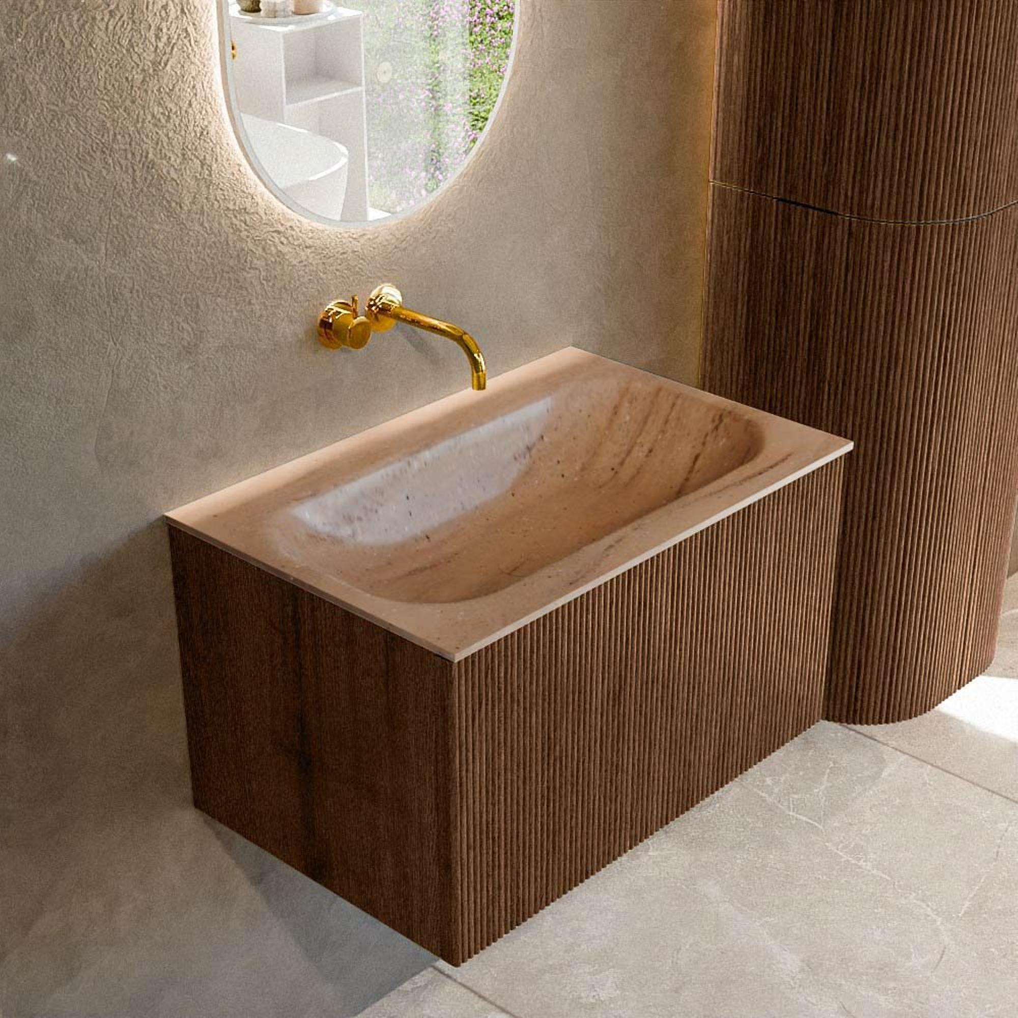 MONDIAZ KURVE-DLUX 70cm badmeubel kleur Walnut met 1 lade en 0 deuren. Wastafel BIG SMALL Midden zonder kraangat Saba.