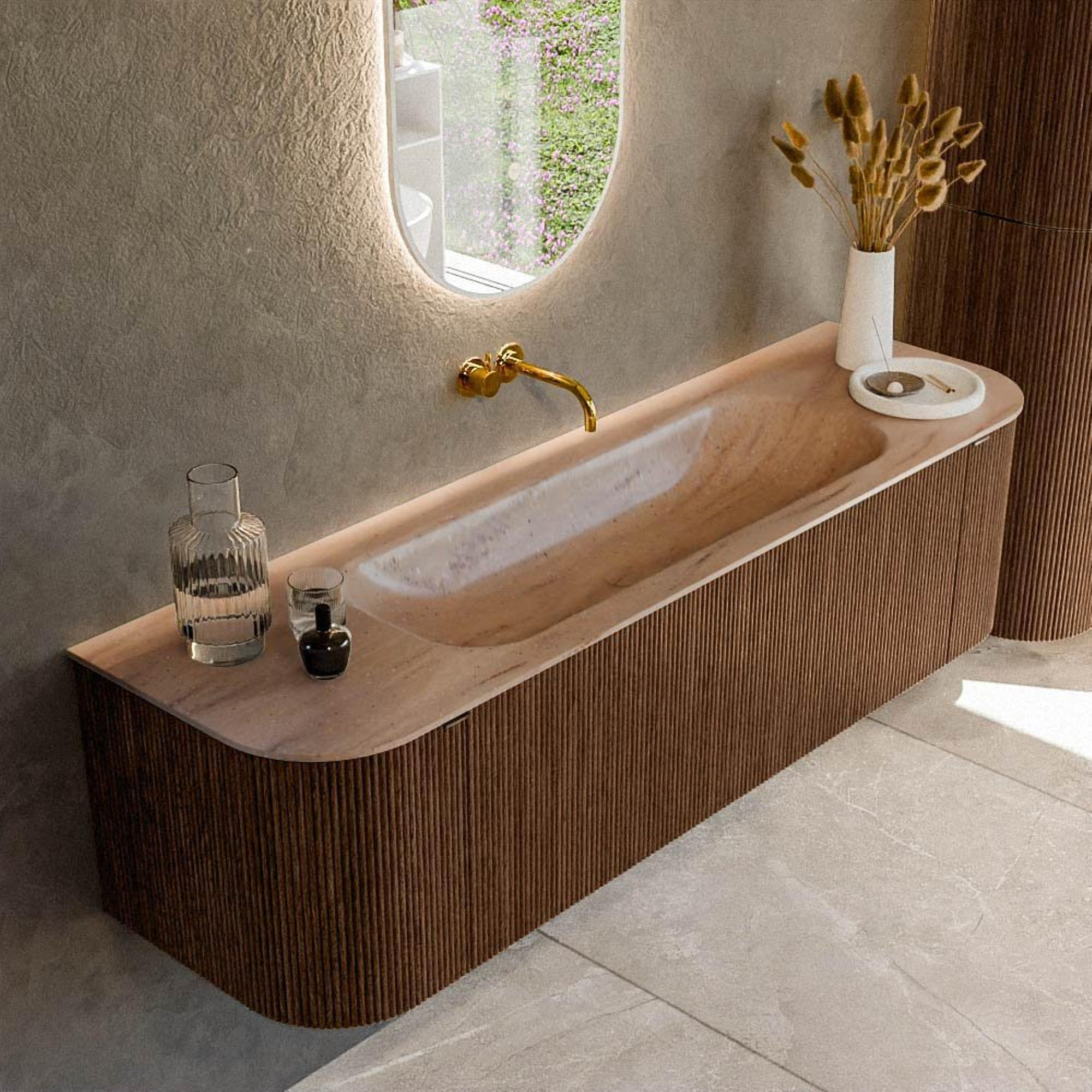 MONDIAZ KURVE-DLUX 160cm badmeubel ronding Links + Rechts kleur Walnut met 1 lade en 2 deuren. Wastafel BIG MEDIUM Midden zonder kraangat Saba.
