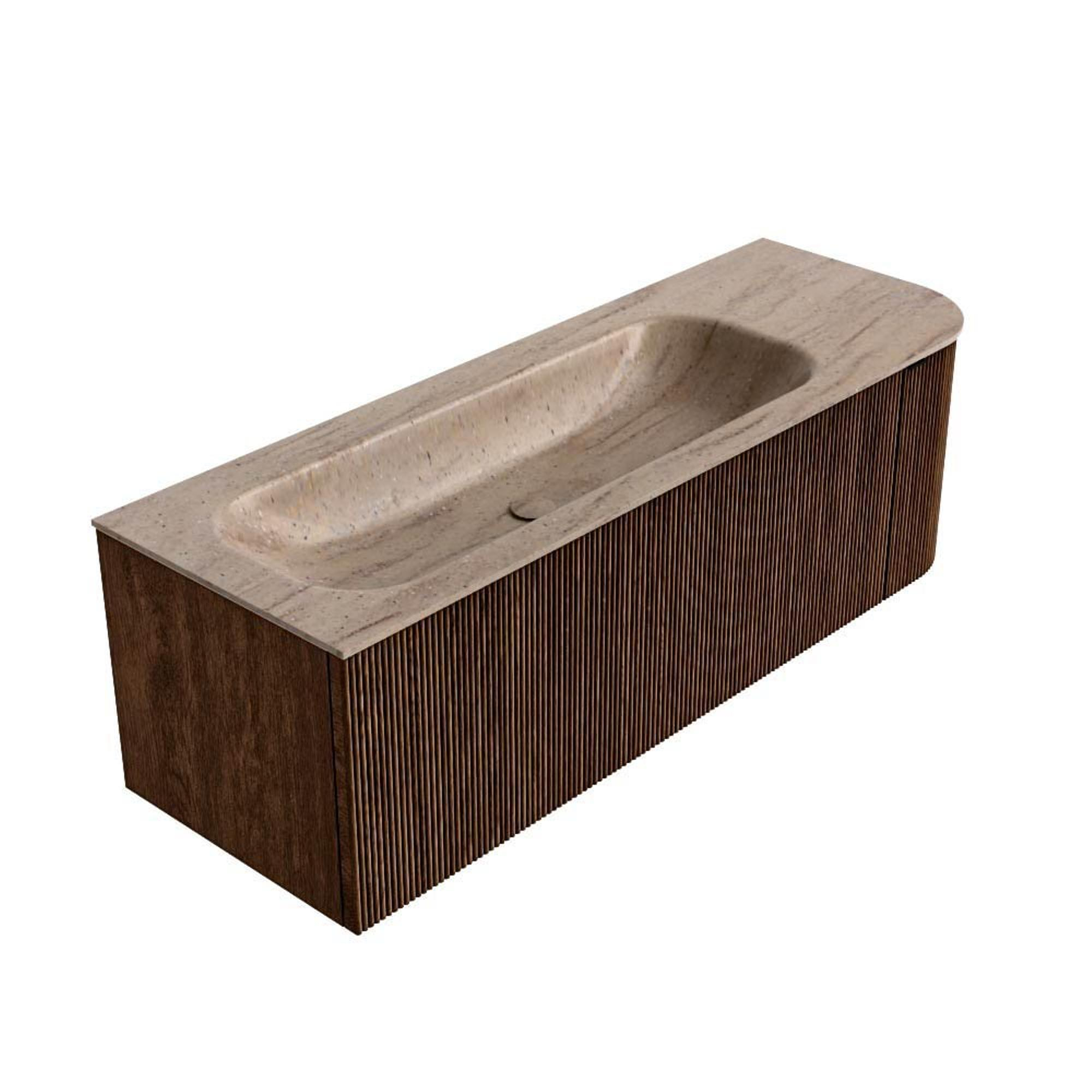 MONDIAZ KURVE-DLUX 135cm badmeubel ronding Rechts kleur Walnut met 1 lade en 1 deur. Wastafel BIG MEDIUM Links zonder kraangat Saba.