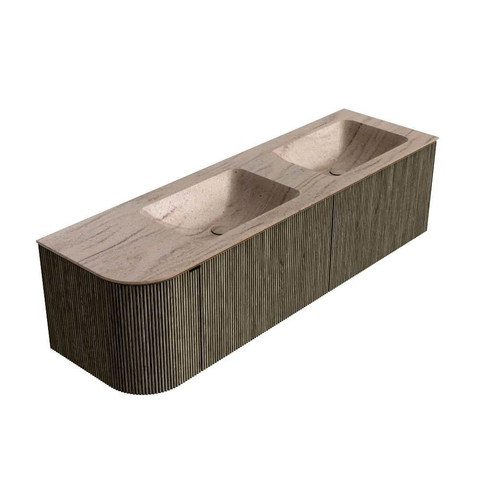 MONDIAZ KURVE-DLUX 155cm badmeubel ronding Links kleur Shadow met 2 lades en 1 deur. Wastafel LEAF Dubbel / Rechts zonder kraangat Saba.