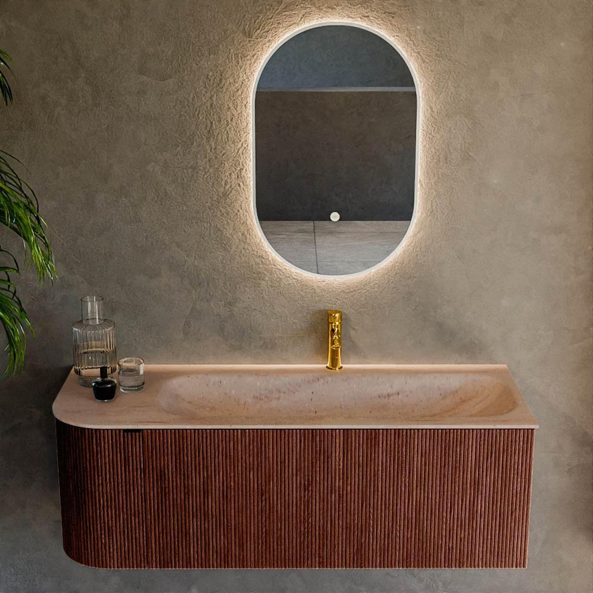 MONDIAZ KURVE-DLUX 125cm badmeubel ronding Links kleur Ruby met 1 lade en 1 deur. Wastafel BIG MEDIUM Rechts 1 kraangat Saba.