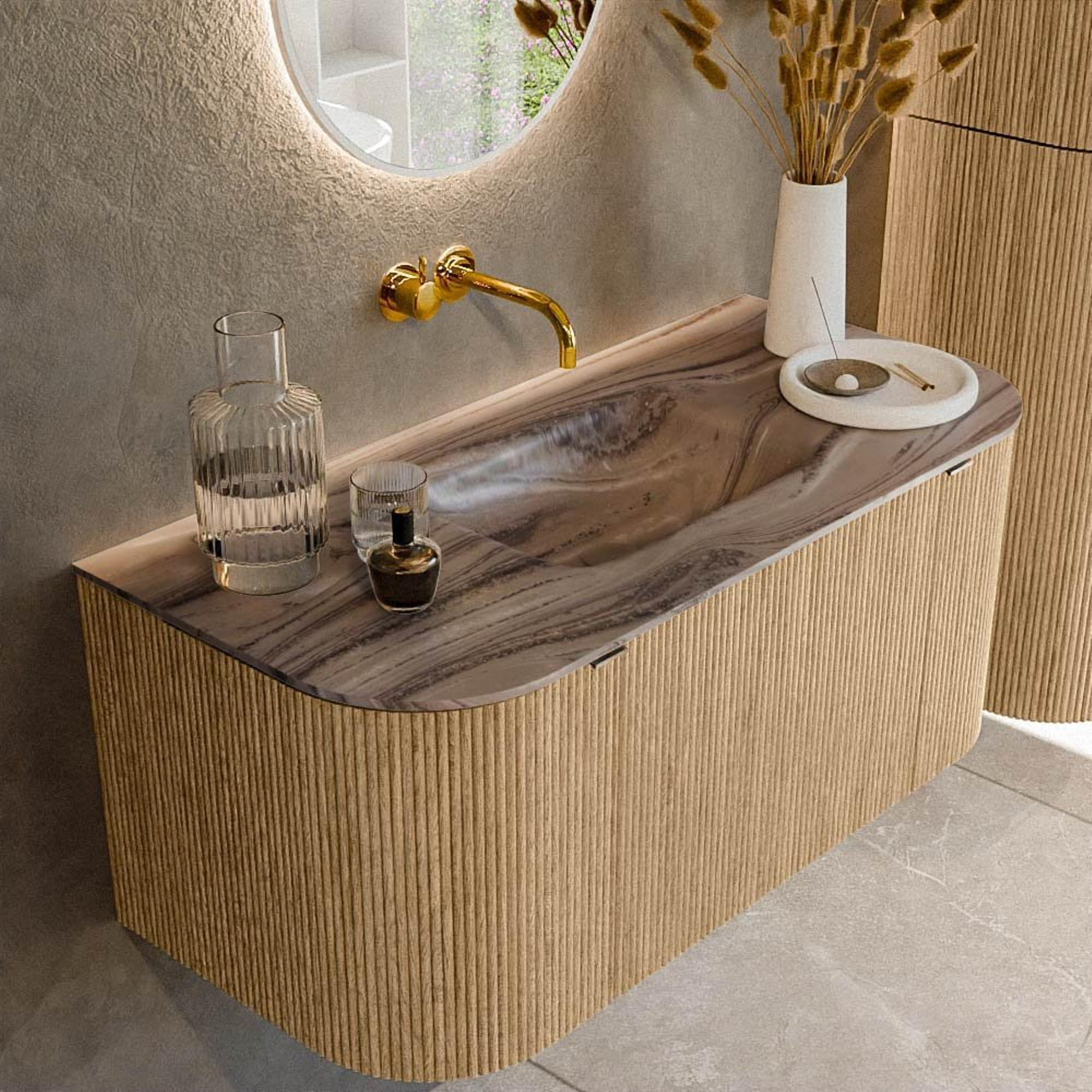 MONDIAZ KURVE-DLUX 100cm badmeubel ronding Links + Rechts kleur Oak met 1 lade en 2 deuren. Wastafel GRUNNE Midden zonder kraangat Sombra.
