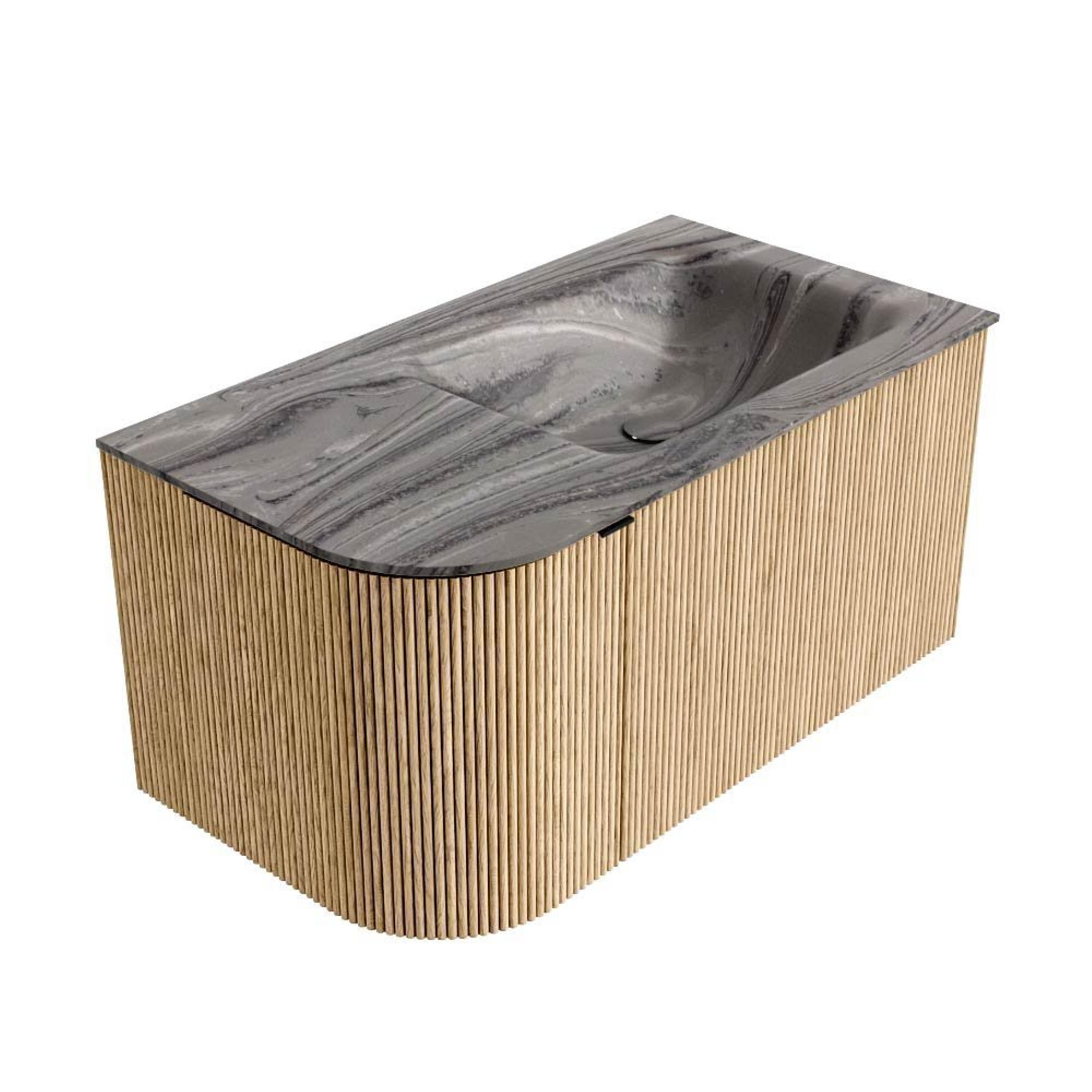 MONDIAZ KURVE-DLUX 85cm badmeubel ronding Links kleur Oak met 1 lade en 1 deur. Wastafel CLOUD Rechts 1 kraangat Sombra.