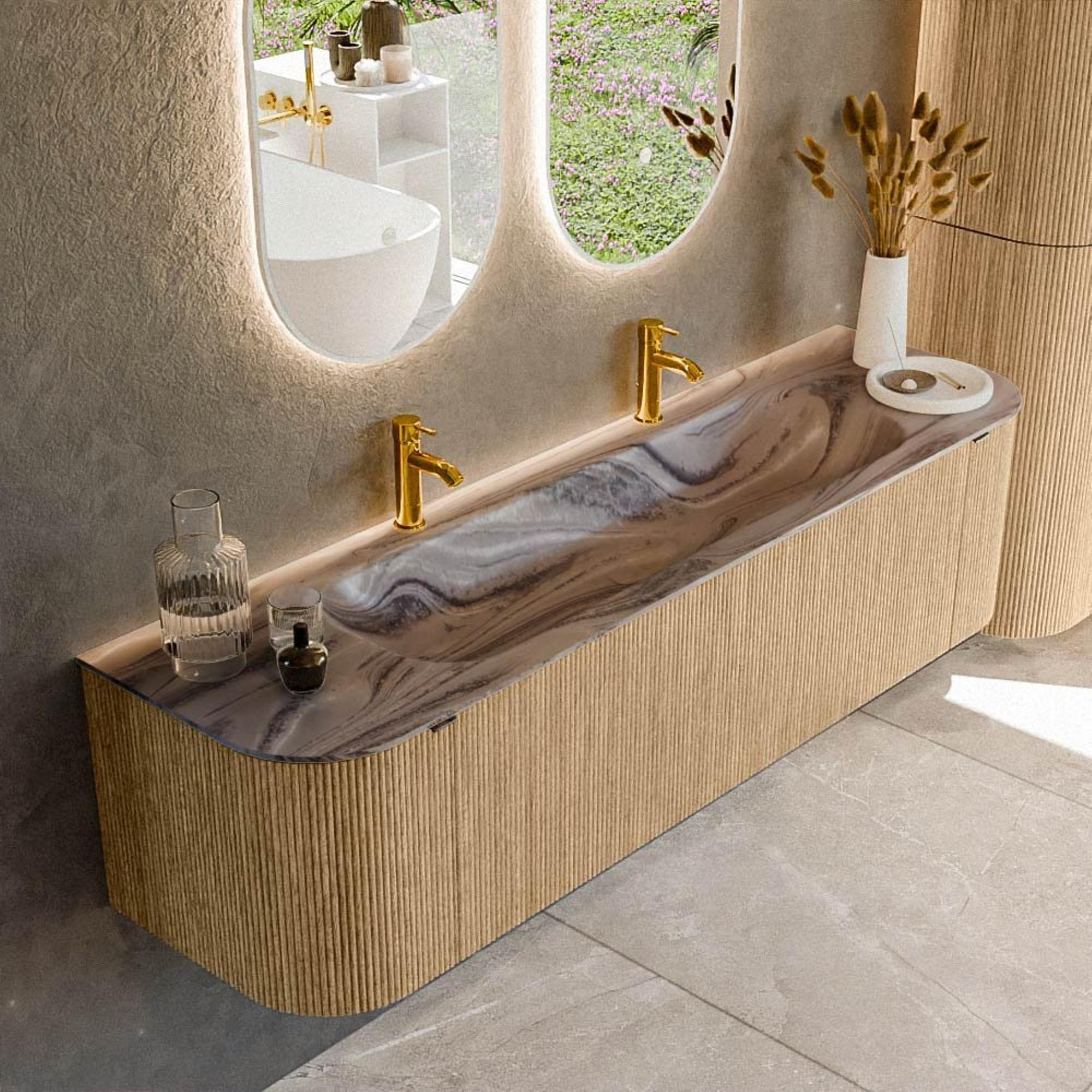 MONDIAZ KURVE-DLUX 170cm badmeubel ronding Links + Rechts kleur Oak met 1 lade en 2 deuren. Wastafel BIG LARGE Midden 2 kraangaten Sombra.