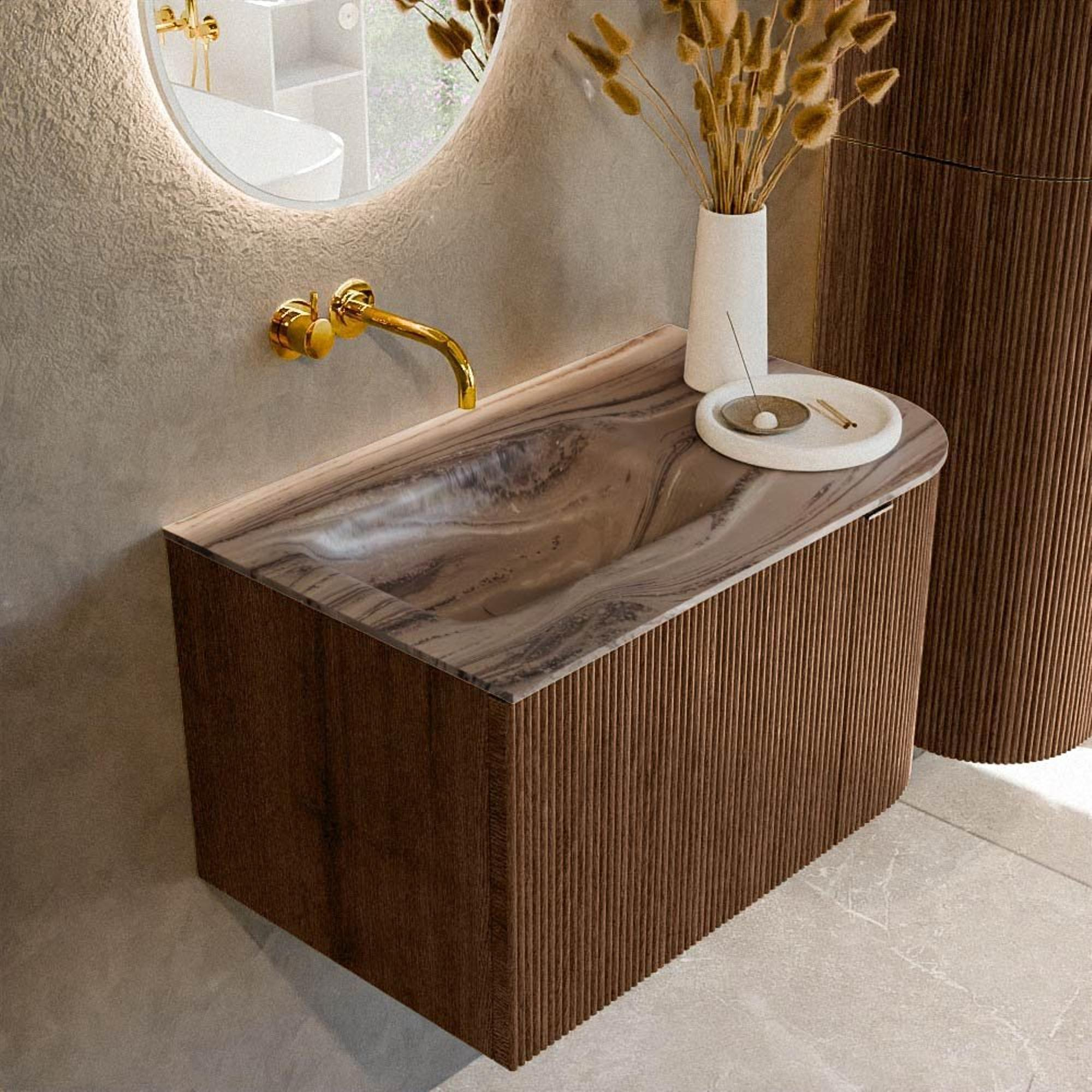 MONDIAZ KURVE-DLUX 75cm badmeubel ronding Rechts kleur Walnut met 1 lade en 1 deur. Wastafel GRUNNE Links zonder kraangat Sombra.