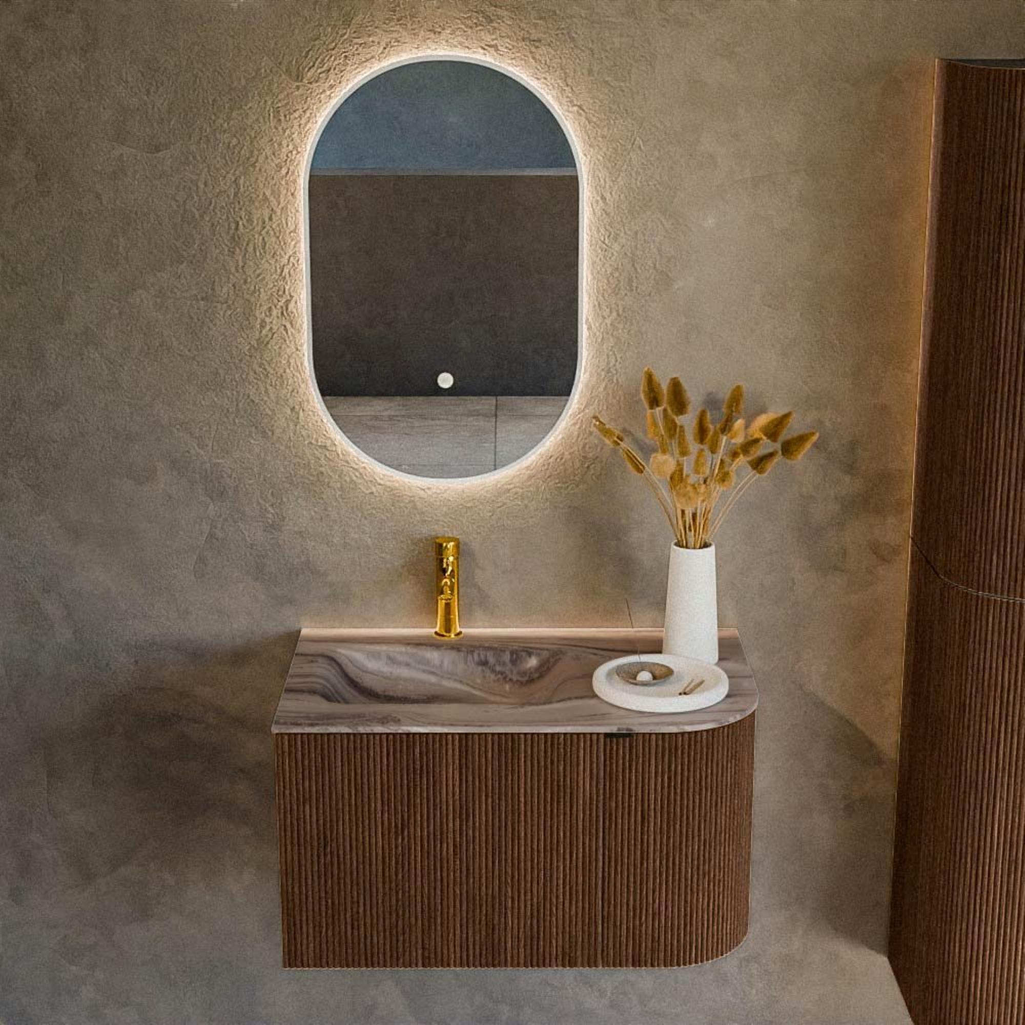 MONDIAZ KURVE-DLUX 75cm badmeubel ronding Rechts kleur Walnut met 1 lade en 1 deur. Wastafel GRUNNE Links 1 kraangat Sombra.