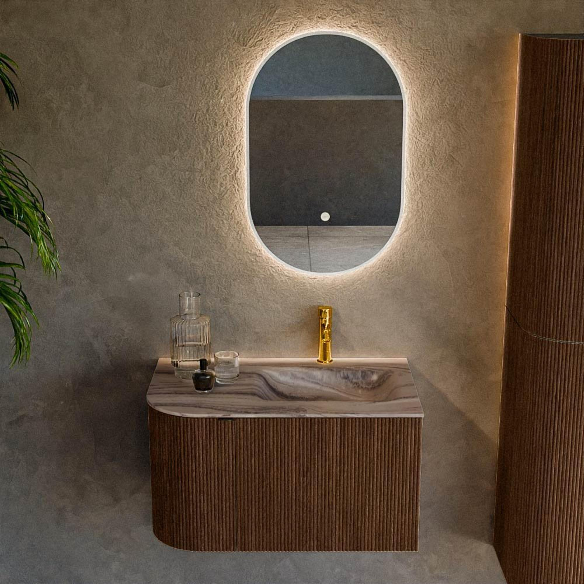 MONDIAZ KURVE-DLUX 75cm badmeubel ronding Links kleur Walnut met 1 lade en 1 deur. Wastafel GRUNNE Rechts 1 kraangat Sombra.