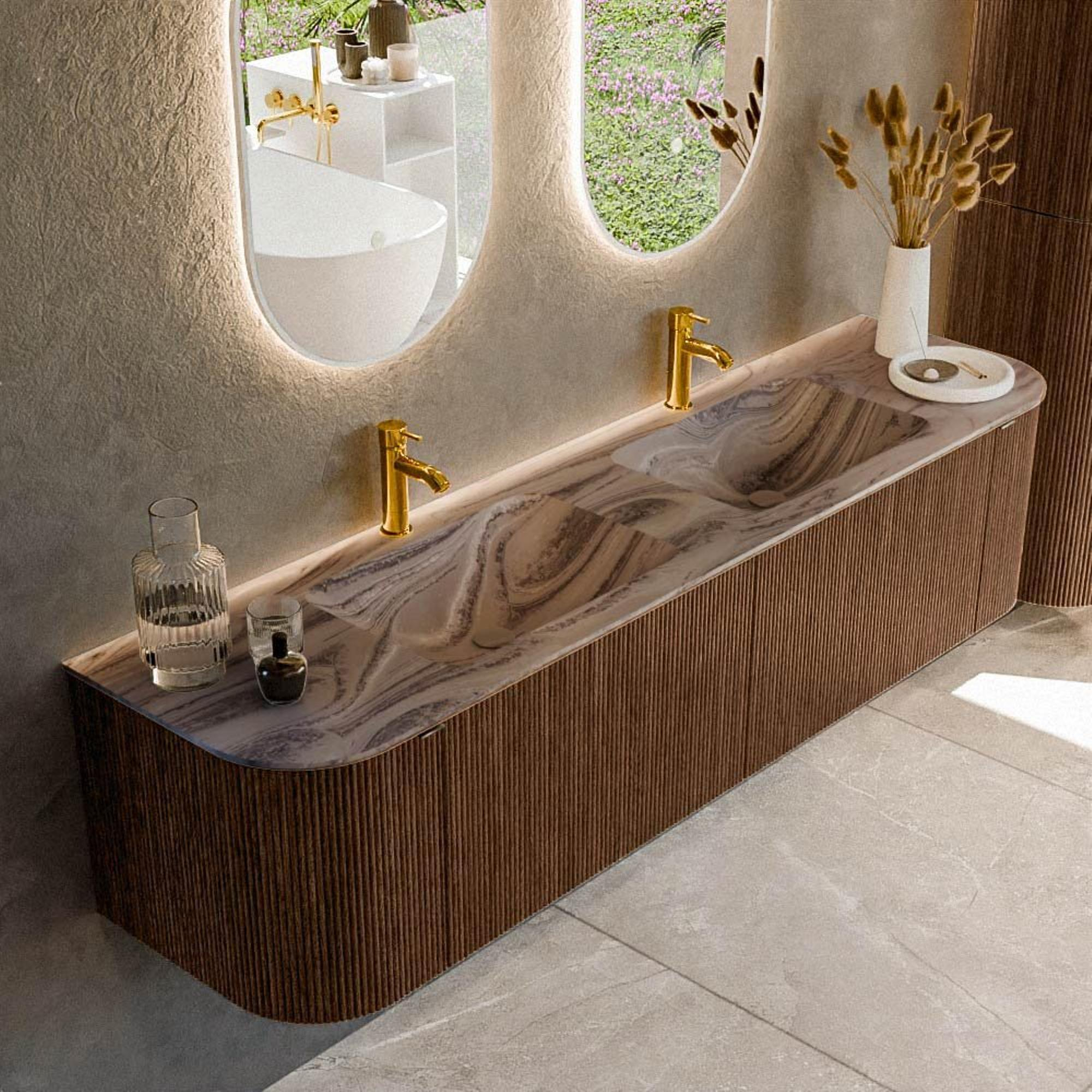 MONDIAZ KURVE-DLUX 180cm badmeubel ronding Links + Rechts kleur Walnut met 2 lades en 2 deuren. Wastafel LEAF Dubbel 2 kraangaten Sombra.