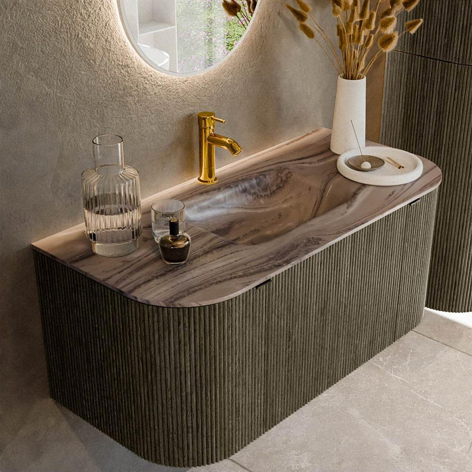 MONDIAZ KURVE-DLUX 100cm badmeubel ronding Links + Rechts kleur Shadow met 1 lade en 2 deuren. Wastafel GRUNNE Midden 1 kraangat Sombra.