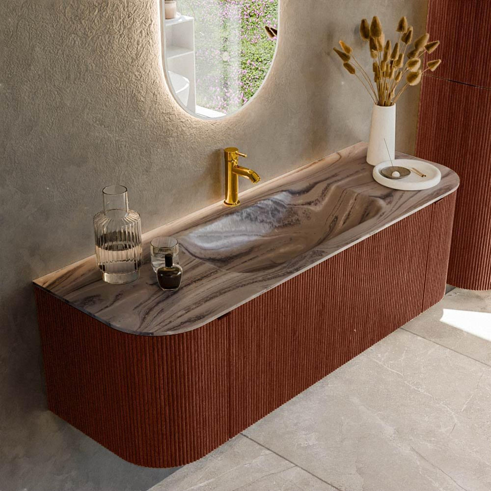 MONDIAZ KURVE-DLUX 140cm badmeubel ronding Links + Rechts kleur Ruby met 1 lade en 2 deuren. Wastafel BIG SMALL Midden 1 kraangat Sombra.