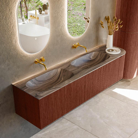 MONDIAZ KURVE-DLUX 175cm badmeubel ronding Rechts kleur Ruby met 2 lades en 1 deur. Wastafel STOR SMALL Dubbel / Links zonder kraangat Sombra.